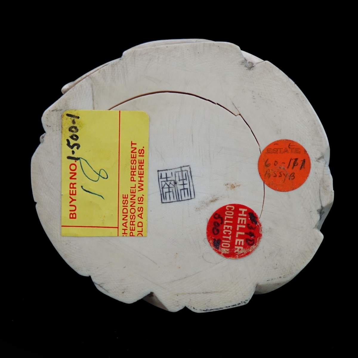 Large Chinese Carved Seated Guanyin Figure on Wooden Stand. Signed. Measures 11" x 4-1/2" (w/o stand). We Will Not Ship This Item Out of State of Florida. Anyone Having This Item Shipped Must Have a Florida Address or the Item will not be Shipped. We will Not Knowingly Sell Endangered Species outside of Legal Channels. Condition: Loss to the flame detail, stress line otherwise good condition. Estimate: $600.00 - $800.00 Domestic Shipping: $68.00