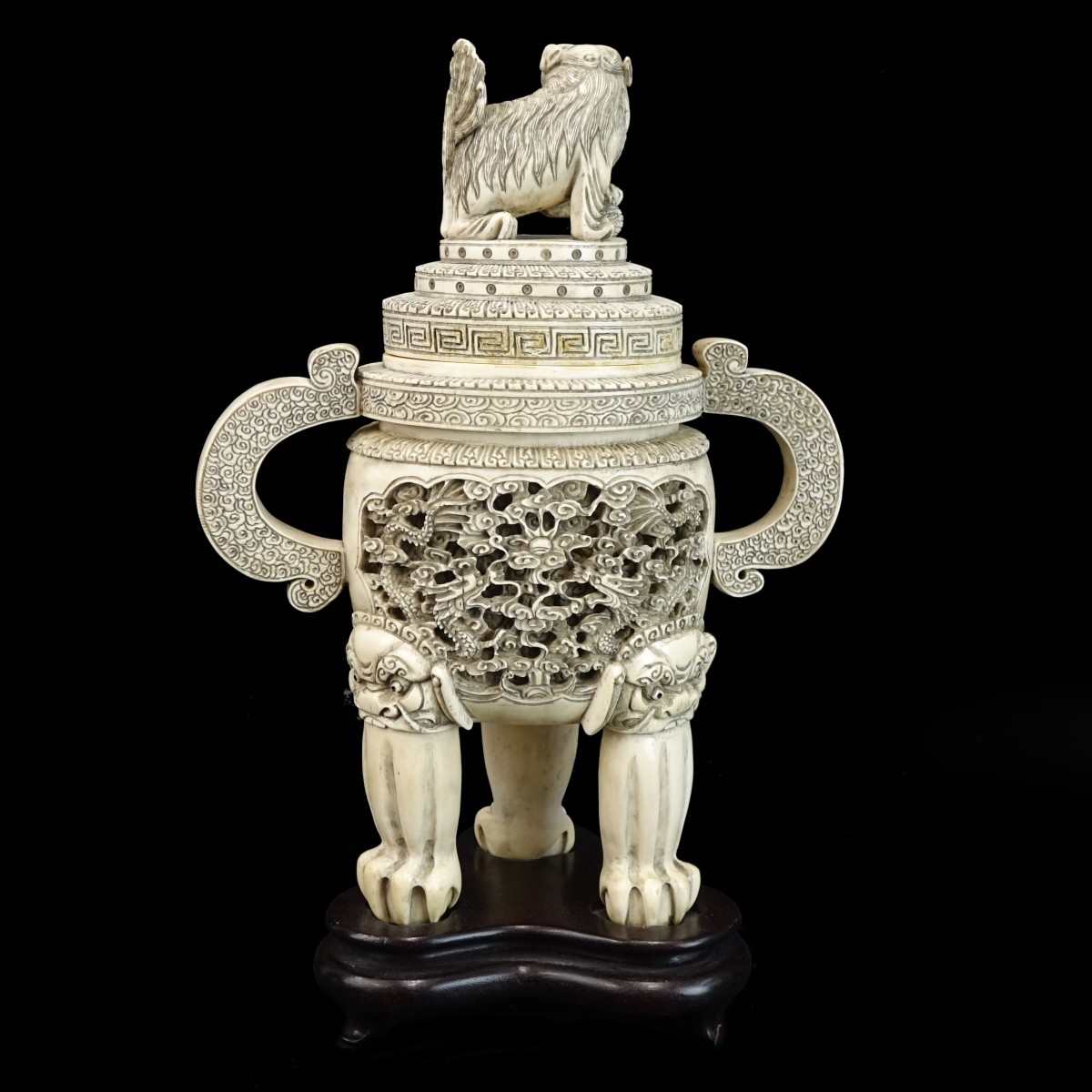 Large Chinese Carved Tripod Censer Mounted on Wooden Stand. Signed beneath the cover, on interior, and on the base. Measures 12-1/2" x 9-1/4" (w/o stand). We Will Not Ship This Item Out of State of Florida. Anyone Having This Item Shipped Must Have a Florida Address or the Item will not be Shipped. We will Not Knowingly Sell Endangered Species outside of Legal Channels. Condition: Foo dog finial has a loss, some surface residue otherwise good condition. Estimate: $500.00 - $700.00 Domestic Shipping: $78.00