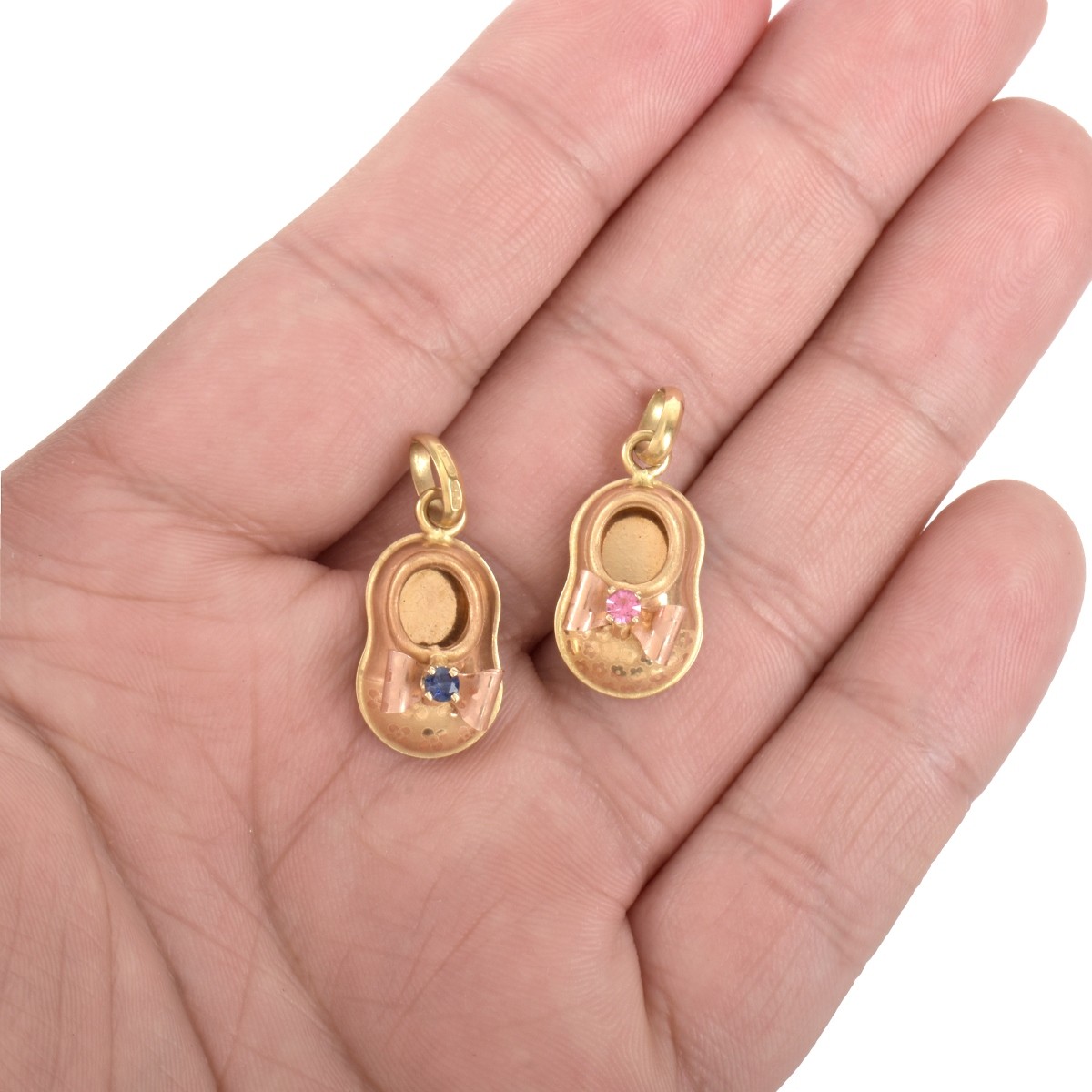 Two Vintage Italian 14 Karat Yellow Gold and Sapphire Baby Shoe Charms / Pendants. Stamped 585 and Italian hallmark. Measure 1" l, 7/16" W. Approx. weight: 3.66 grams. Condition: Very good condition. Estimate: $100.00 - $150.00 Domestic Shipping: $30.00