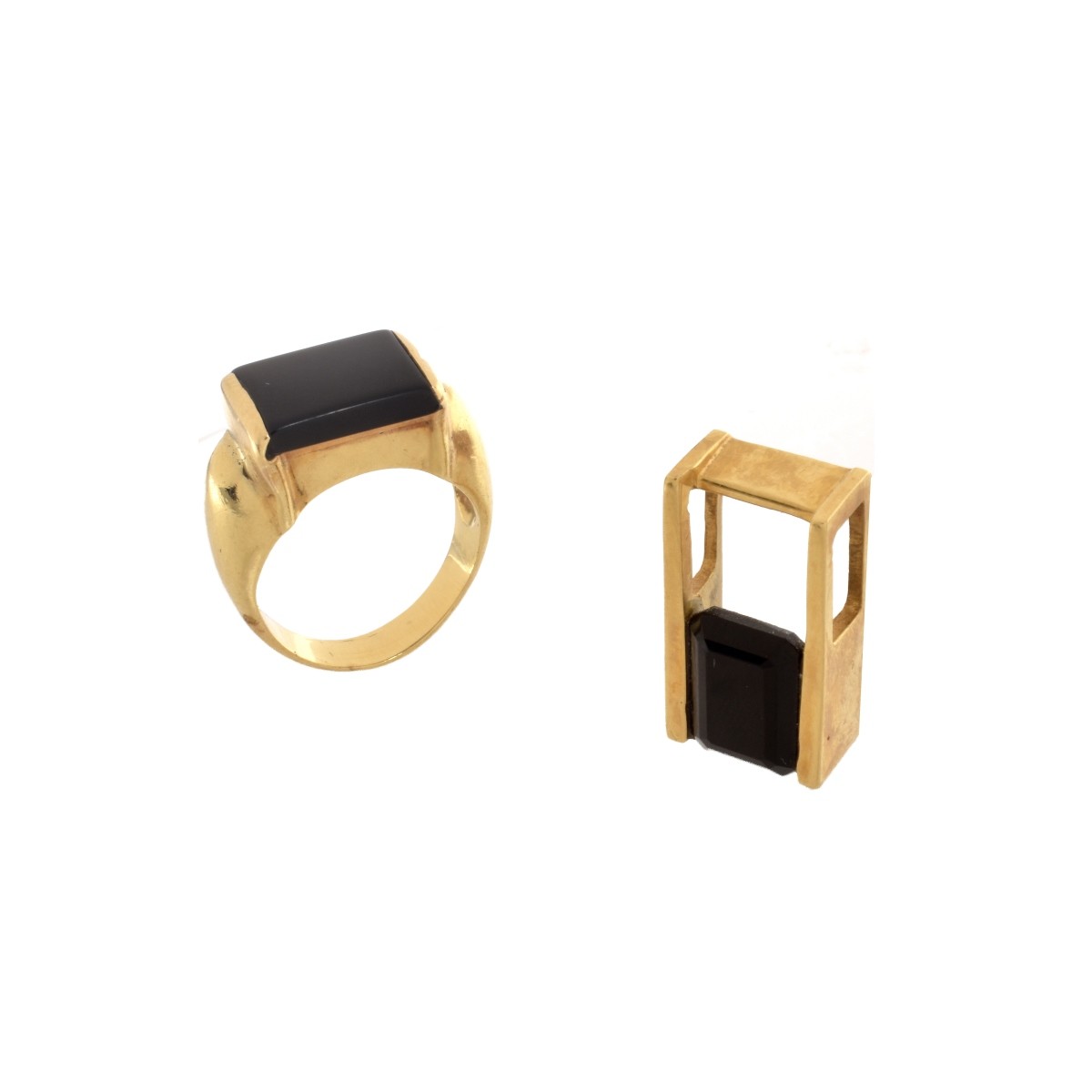 Vintage Black Onyx and 14 Karat Yellow Gold Ring and Pendant. Ring size 3-1/2. Pendant measures 3/4" x 3/8". Approx. total weight: 9.34 grams. Condition: Good vintage condition. Estimate: $200.00 - $300.00 Domestic Shipping: $30.00
