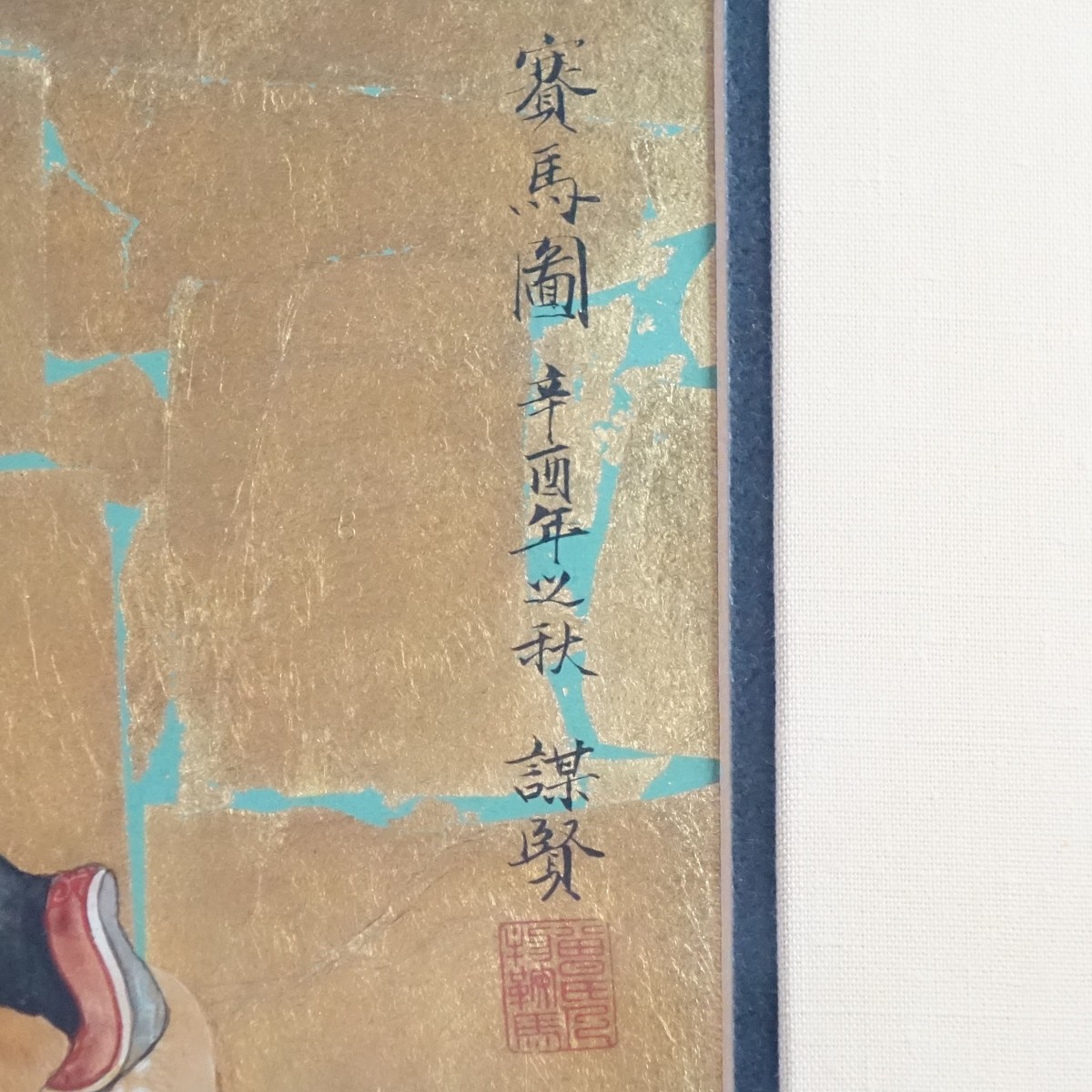 Tseng Mou-Sien, Mongolian (b. 1985) Oil and Gold Leaf on Paper "Horse Racing at Festival" Stamp and Calligraphy Signed. Measures 15-1/4" x 38-1/2", frame measures 26" x 49-3/4". Condition: Good condition. Estimate: $100.00 - $400.00 Domestic Shipping: Third party