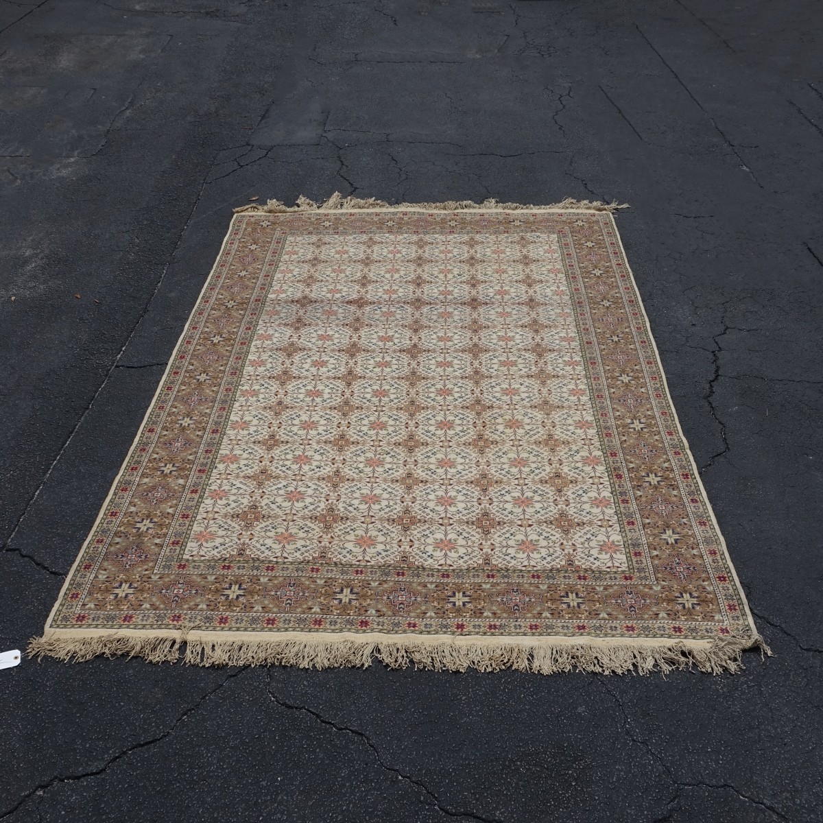 Vintage Persian Kashan Style Wool Rug. Continuous pattern en center and floral pattern on border. Measures 9'8" x 6'5". Condition: Dirty, needs cleaning, appears to have a spot in the center Estimate: $200.00 - $400.00 Domestic Shipping: Third party