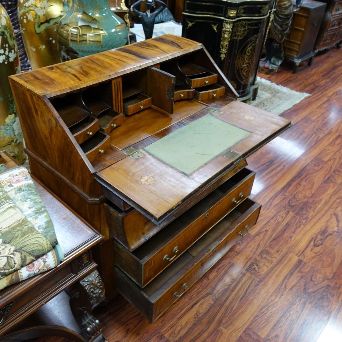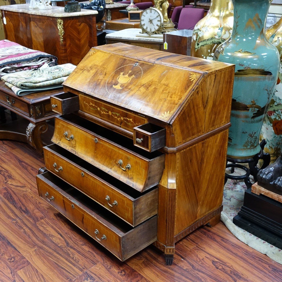 Antique Continental Marquetry Inlaid Drop Front Secretaire Desk. Two drawers on frieze and three large sliding drawers with key holes, interior storage compartments, separates into two pieces, and stands on bracket feet. Measures 42" H x 38" W x 22" D. Condition: Restored condition, replaced feet, some wear to the veneer otherwise good condition Estimate: $300.00 - $500.00 Domestic Shipping: Third party