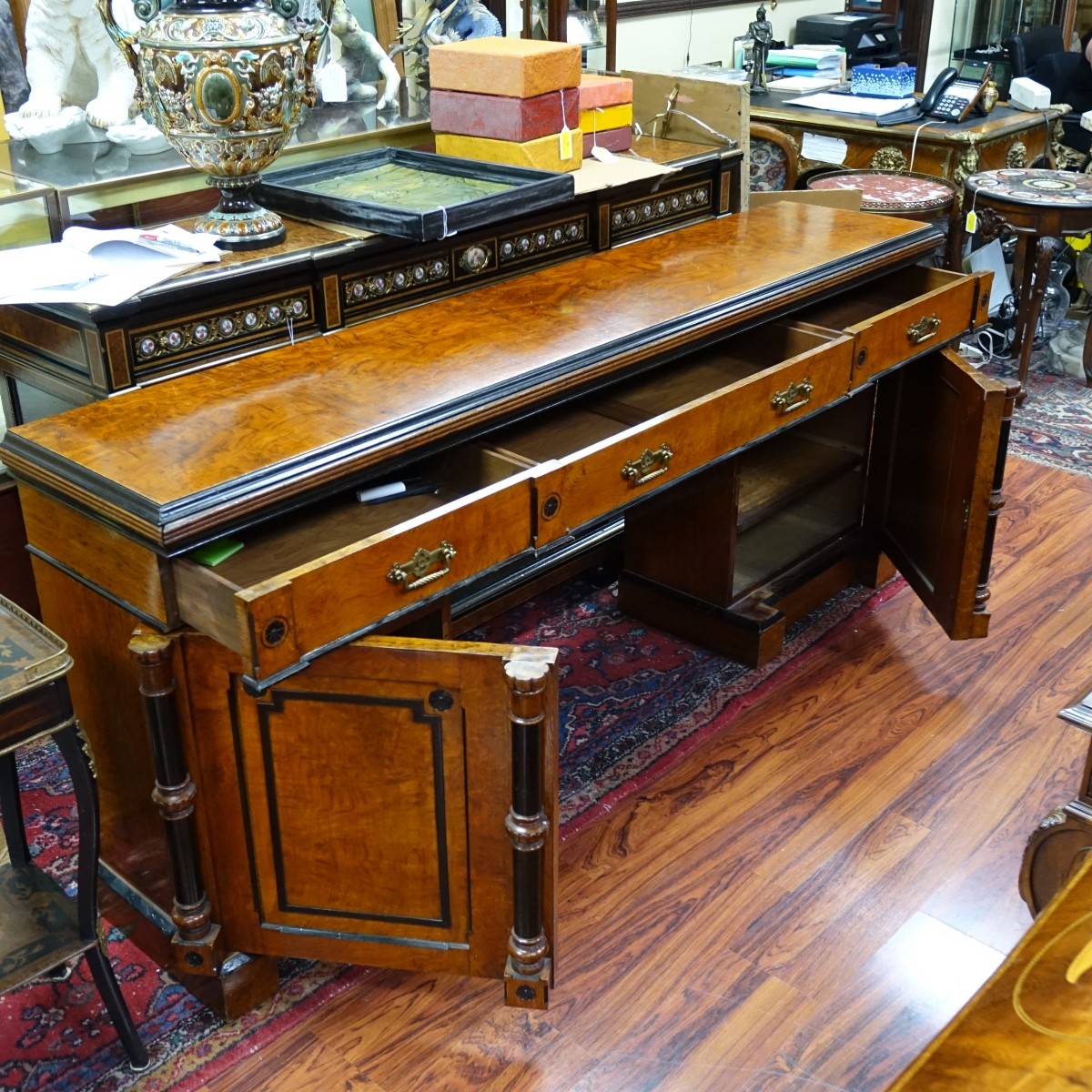 19th Century English Pollard Oak Double Pedestal Sideboard. Partially Ebonized throughout the surface, rectangular top with three sliding drawers supported by twin pedestals with fitted doors, column supports and crest motif. Measures 36-1/2" H x 84" W x 17-1/2" D. Condition: Scratches, some lifting to the veneer at the frieze Estimate: $500.00 - $1000.00 Domestic Shipping: Third party