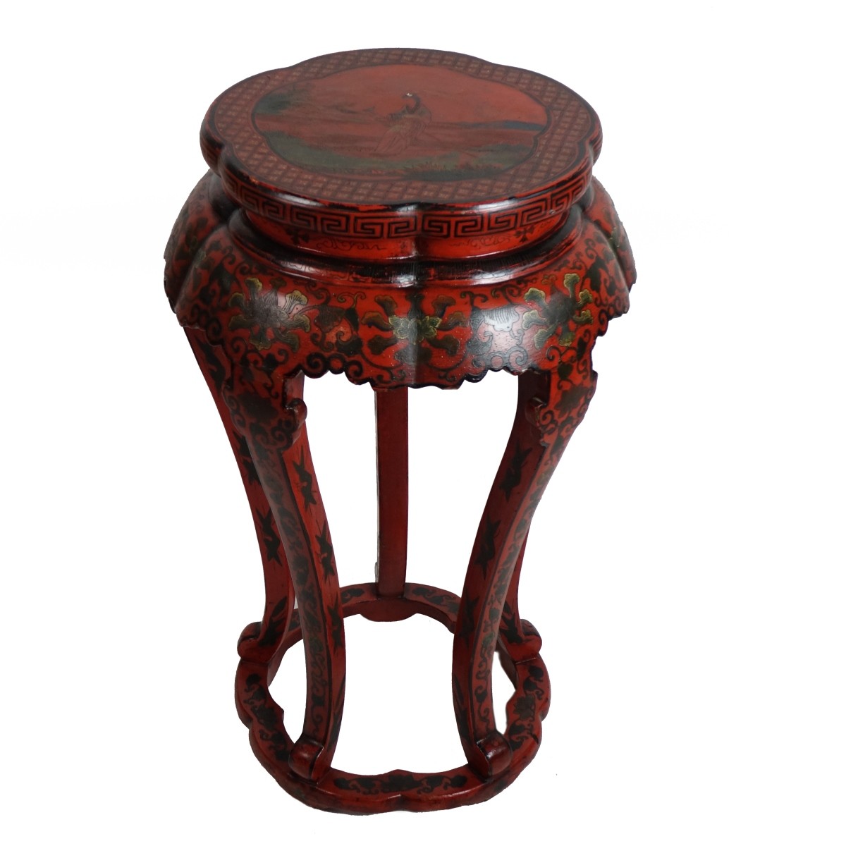 20th Century Chinese Red Lacquered Wooden Pedestal. Elaborate floral decor on surface, figural scene on the top, stands on five curved legs ending in a conforming base. Measures 33" H x 20" W. Provenance: The estate of Leon Amar, Palm Beach, Florida. Condition: Some wear and small paint loss to the top, small chips and rubbing to the surface otherwise good condition Estimate: $50.00 - $150.00 Domestic Shipping: Third party