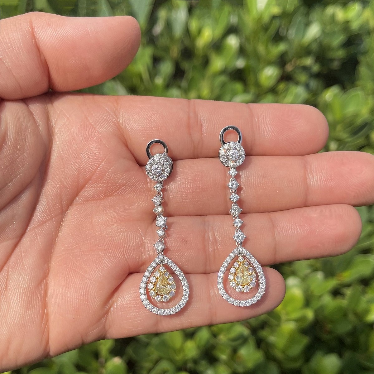 .82 Carat TW Two Pear Shape Fancy Yellow Diamond, 3.35 Carat TW Round Brilliant Cut Diamond and 18 Karat White and Yellow Gold Pendant Earrings. Colorless diamonds E-F color, VS clarity. Stamped 750. Measure 2" L, 9/16" W. Approx. weight: 10.86 grams. Condition: Very good condition. For additional information and/or WhatsApp video please contact our resident GIA Graduate Gemologist, Russ Kodner at 954.650.5030 Estimate: $8000.00 - $12,000.00 Domestic Shipping: $30.00