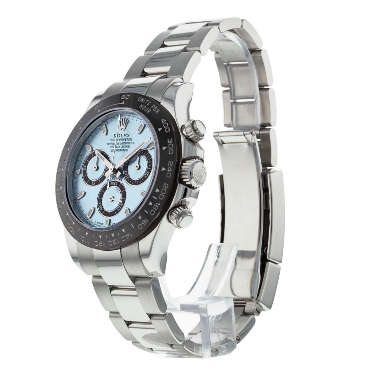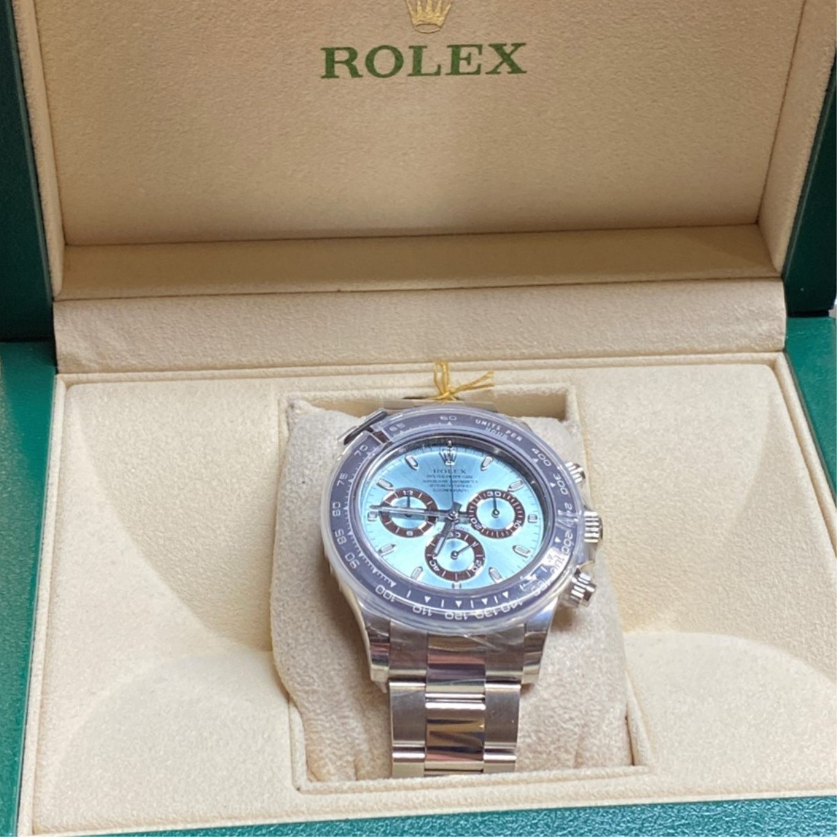 New 2021 Rolex Daytona Cosmograph 116506-0001 Platinum Bracelet Watch with Ice Blue Dial, Chestnut Brown Bezel. Automatic self-winding movement. Case measures 40mm. New unused with box and papers. Condition: New unused condition. Please note the gallery does not warranty the running condition of watches. Estimate: $100,000.00 - $150,000.00 Domestic Shipping: $44.00