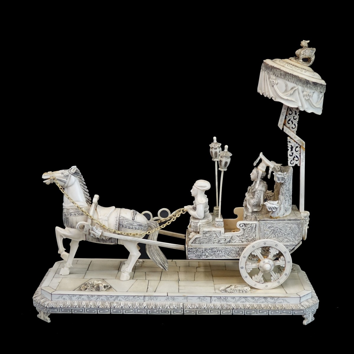 Antique Chinese Carved Horse Drawn Carriage. Unmarked. Measures 12-3/8" x 12-3/4" x 5-1/4". We Will Not Ship This Item Out of State of Florida. Anyone Having This Item Shipped Must Have a Florida Address or the Item will not be Shipped. We will Not Knowingly Sell Endangered Species outside of Legal Channels. Condition: Some restorations, glue residue on surface otherwise good condition. Estimate: $1000.00 - $1500.00 Domestic Shipping: Third party