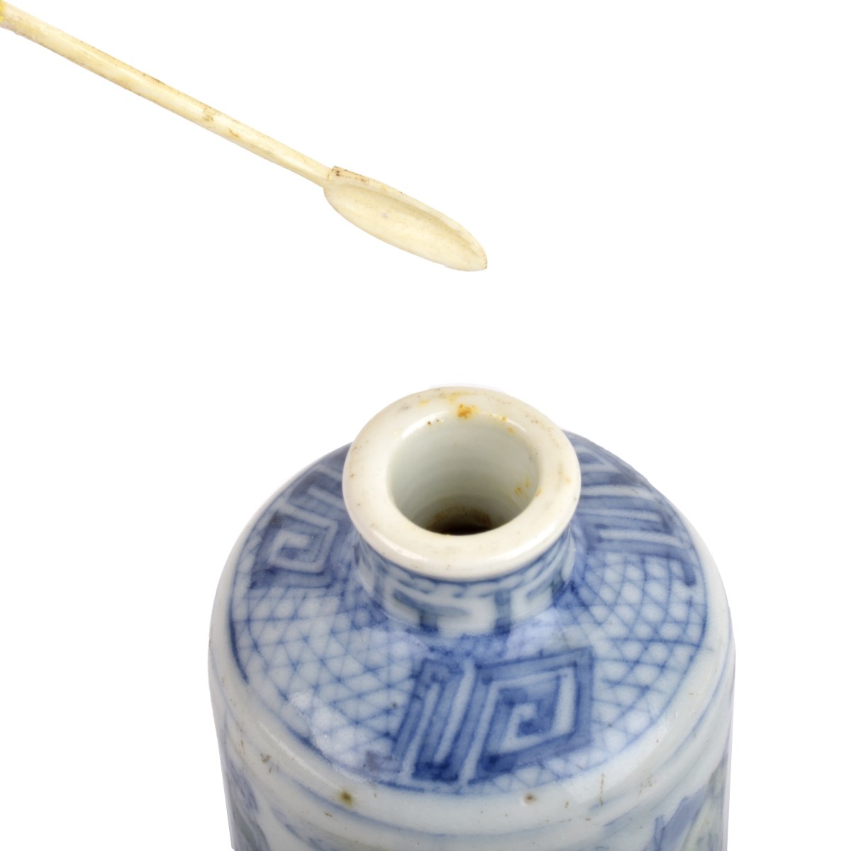 Chinese Blue and White Porcelain Snuff Bottle with Jade Cover and Presented on Wooden Stand. Topographical scene with figures motif. Measures 3-5/8" (w/o stand). Condition: Rubbing otherwise good condition. Estimate: $100.00 - $200.00 Domestic Shipping: $38.00