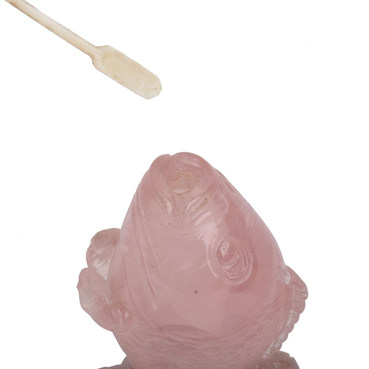 Chinese Rose Quartz Fish Form Snuff Bottle on Wooden Stand. Measures 2-1/4" (w/o stand). Condition: Good condition. Estimate: $50.00 - $250.00 Domestic Shipping: $32.00
