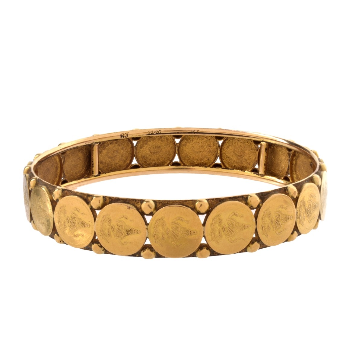 Vintage Asian 22/20 Karat Yellow Gold "Coin" Bangle Bracelet. Stamped 22/20. Measures 7-1/4" L, 7/16" W. Approx. weight: 20.28 grams. Condition: Good vintage condition. needs cleaning. Estimate: $600.00 - $800.00 Domestic Shipping: $30.00