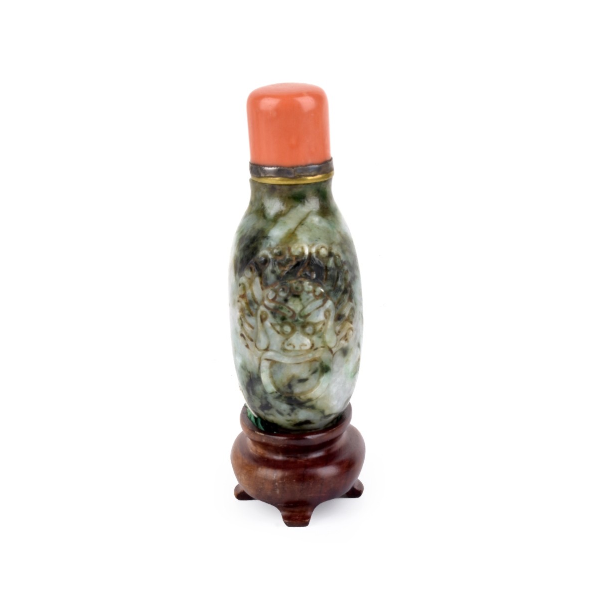 Chinese Green Jade Snuff Bottle with Coral Cover and Presented on Wooden Stand. Foo dog mock handle detail Measures 3-1/2" x 2" (w/o stand). Condition: Cover missing spoon otherwise good condition. Estimate: $150.00 - $250.00 Domestic Shipping: $38.00