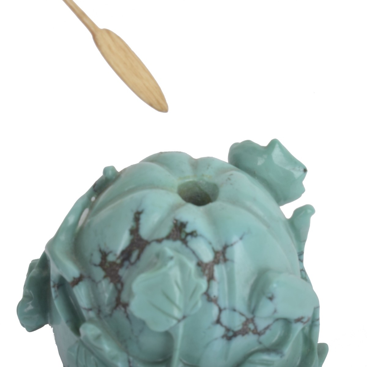 Chinese Carved Turquoise Peach Form Snuff Bottle on Wooden Stand. Measures 2-1/4" x 1-3/4" (w/o stand). Condition: Good condition. Estimate: $200.00 - $400.00 Domestic Shipping: $32.00
