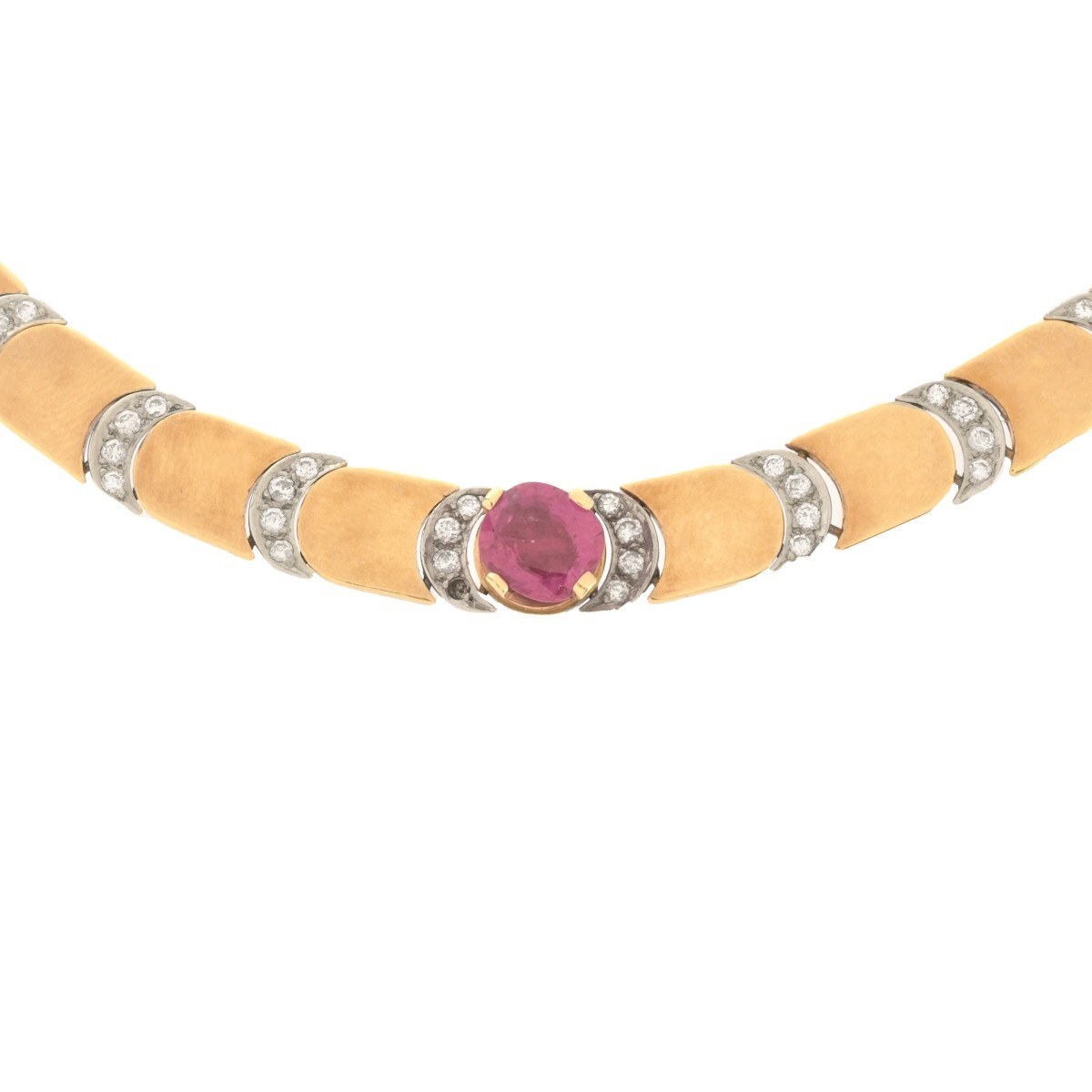 Vintage Italian Approx. 1.0 Carat Round Cut Ruby, .85-1.0 Carat TW Pave Set Round Brilliant Cut Diamond and 14 Karat Yellow Gold Necklace. Ruby with vivid color, measures 7.5mm. Stamped Italy, 14K NRK. Measures 16-1/8" L, 5/16" W. Approx. weight: 35.74 grams. Condition: Good vintage condition. Surface wear from normal use. Estimate: $1000.00 - $2000.00 Domestic Shipping: $32.00