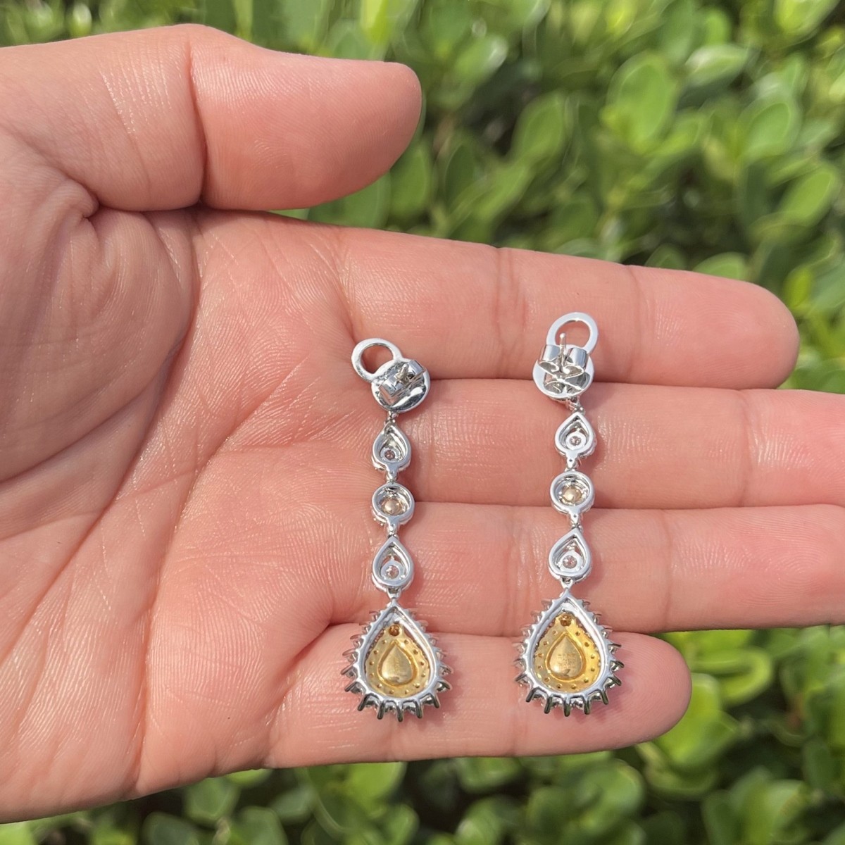 1.08 Carat TW Two Pear Shape Fancy Yellow Diamond, 4.0 Carat TW Round Brilliant Cut Diamond and 18 Karat White, Yellow and Rose Gold Pendant Earrings. Colorless diamonds E-F color, VS clarity. Stamped 750. Measure 2" L, 1/2" W. Approx. weight: 13.04 grams. Condition: Very good condition. For additional information and/or WhatsApp video please contact our resident GIA Graduate Gemologist, Russ Kodner at 954.650.5030 Estimate: $8000.00 - $12,000.00 Domestic Shipping: $30.00