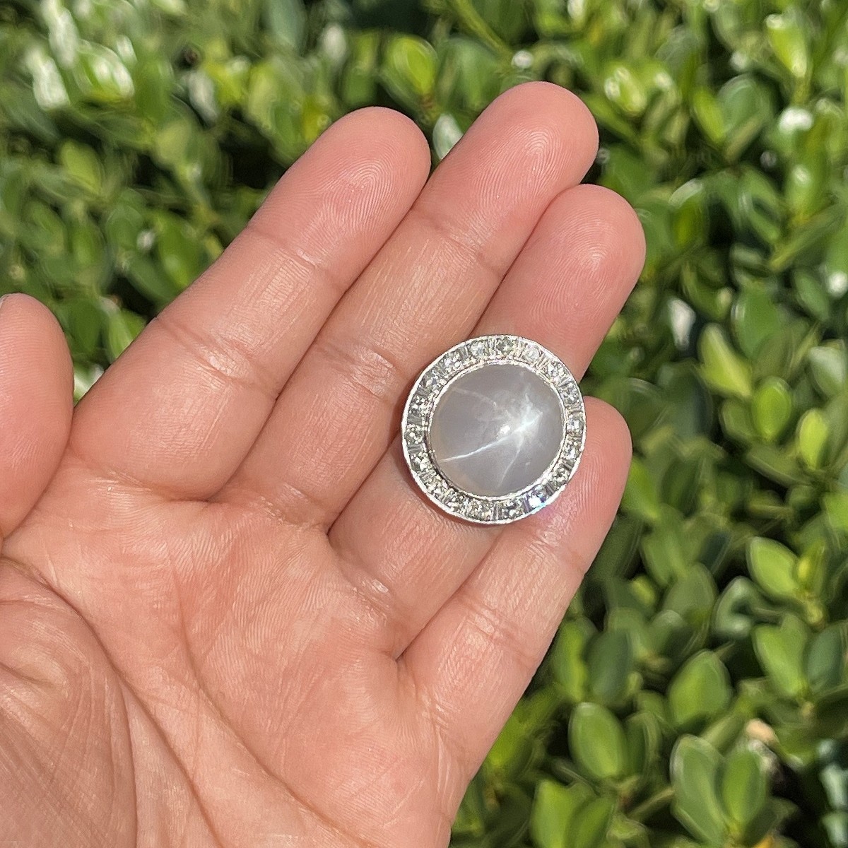 Vintage Approx. 46.0 Carat Double Cabochon Pale Blue Star Sapphire, 1.55 Carat TW Eighteen Round Brilliant Cut Diamond and Filigree 14 Karat White Gold Ring. Sapphire measures 19.0mm diam. Diamonds H-I color, VS clarity. Ring size 5. Approx. weight: 14.60 grams. Condition: Very good vintage condition. Chip to reverse side of sapphire which does not affect the front side. For additional information and/or WhatsApp video please contact our resident GIA Graduate Gemologist, Russ Kodner at 954.650.5030 Estimate: $3000.00 - $5000.00 Domestic Shipping: $30.00