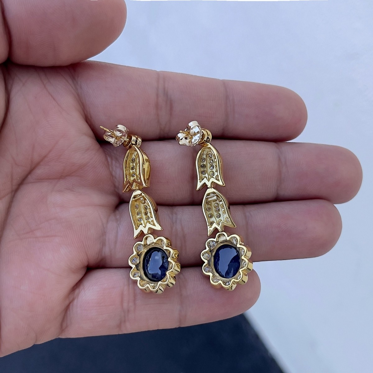 Approx. 12.0 Carat TW Two Oval Cabochon Sapphire, 4.0 Carat TW Round Brilliant Cut Diamond and 18 Karat Yellow Gold Dangle Earrings. Sapphires with vivid color. Diamonds F-G color, VS1-SI1 clarity. Measure 1-3/4"L, 9/16" W. Approx. weight: 17.90 grams. Condition: Very good condition. For additional information and/or WhatsApp video please contact our resident GIA Graduate Gemologist, Russ Kodner at 954.650.5030 Estimate: $8000.00 - $12,000.00 Domestic Shipping: $30.00
