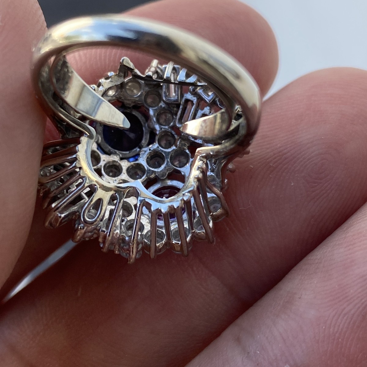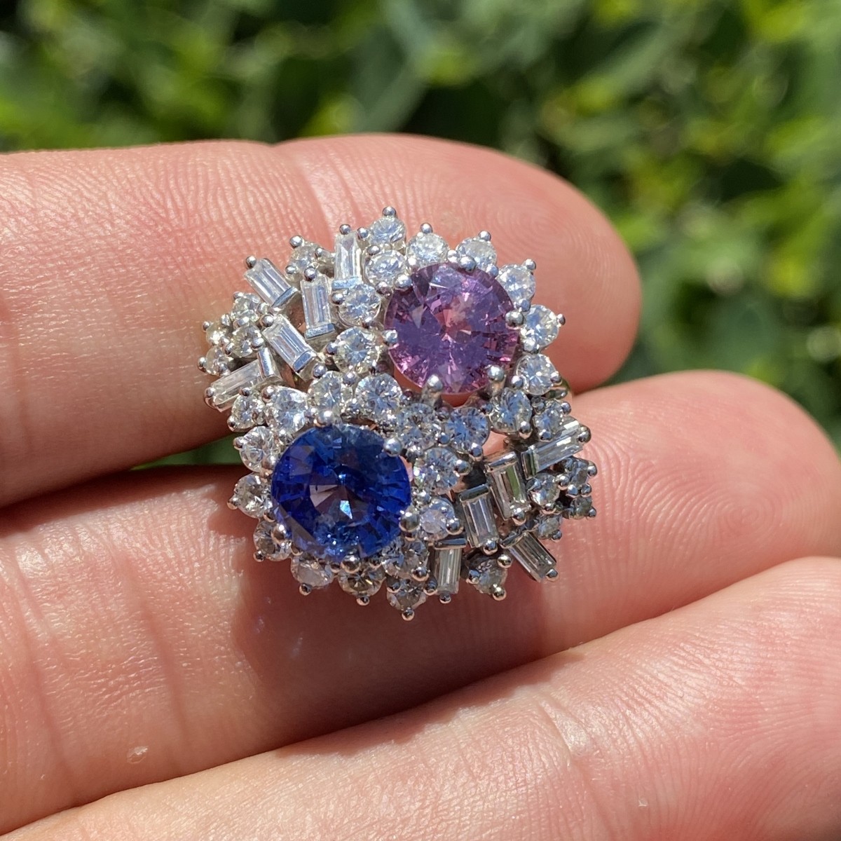Sapphire, Diamond and Platinum Cocktail Ring. Set with an approx. 1.75 carat round brilliant cut natural pink sapphire, 2.15 carat round brilliant cut natural blue sapphire and accented throughout with approx. 2.10 carat TW round brilliant and baguette cut diamonds. Sapphires with vivid color. Diamonds F-G color, VS1-VS2 clarity. Ring size 6-1/2. Approx. weight: 9.53 grams. Condition: Very good condition. For additional information and/or WhatsApp video please contact our resident GIA Graduate Gemologist, Russ Kodner at 954.650.5030 Estimate: $6000.00 - $9000.00 Domestic Shipping: $30.00