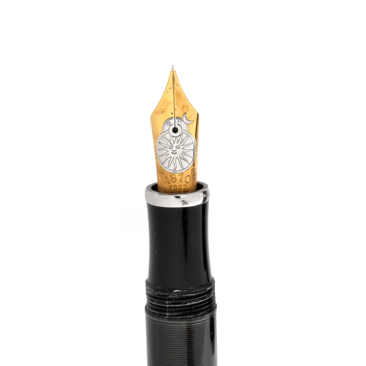 Montblanc "Homage to Nicolaus Copernicus - Patron of Art" Sterling Silver and Black Lacquer Fountain Pen.18K - 750 standard mark on the two toned nib, engraved sun detail, and dated 2008. Numbed 3776 of 4810. Sterling french hallmarks on the cover with Peridot inset stone and mother of pearl cabochon top. Measures 5-1/2" x 5/8". From the collection of The Honorable Ned L. Siegel, Former US Ambassador to the Commonwealth of the Bahamas Condition: Good condition. Not examined for writing. Estimate: $1000.00 - $3000.00 Domestic Shipping: $32.00