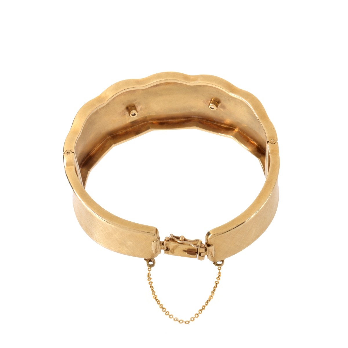 Vintage Italian Small Round Brilliant Cut Diamond and 14 Karat Textured Yellow and White Gold Hinged Cuff Bangle Bracelet. Stamped Italy 14K. Measures 7" L, 7/8" W. Approx. weight:: 38.93 grams. Condition: Very good vintage condition. Estimate: $1200.00 - $1500.00 Domestic Shipping: $32.00