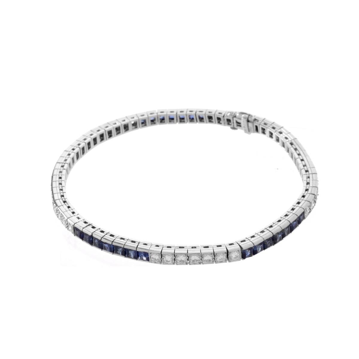Vintage Approx. 1.05 Carat TW Round Brilliant Cut Diamond, Princess Cut Sapphire and Platinum Line Bracelet. Diamonds G-H color, VS1-VS2 clarity. Sapphires with vivid color. measures 7-1/8" L, 1/8" W. Approx. weight: 19.49 grams. Condition: Very good condition. For additional information and/or WhatsApp video please contact our resident GIA Graduate Gemologist, Russ Kodner at 954.650.5030 Estimate: $3000.00 - $5000.00 Domestic Shipping: $32.00