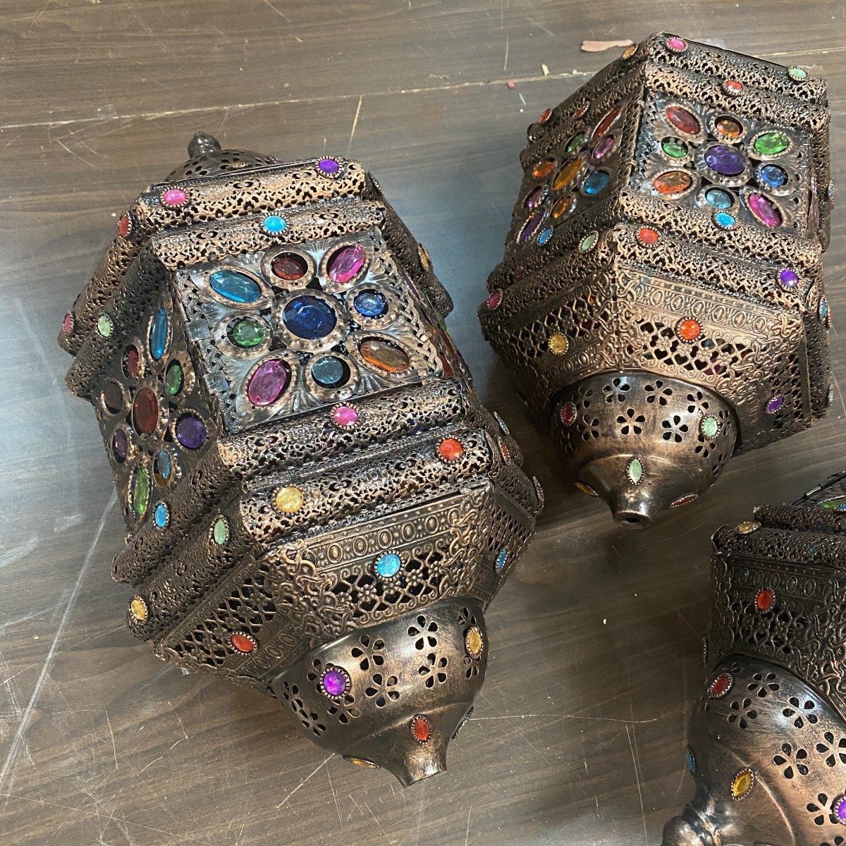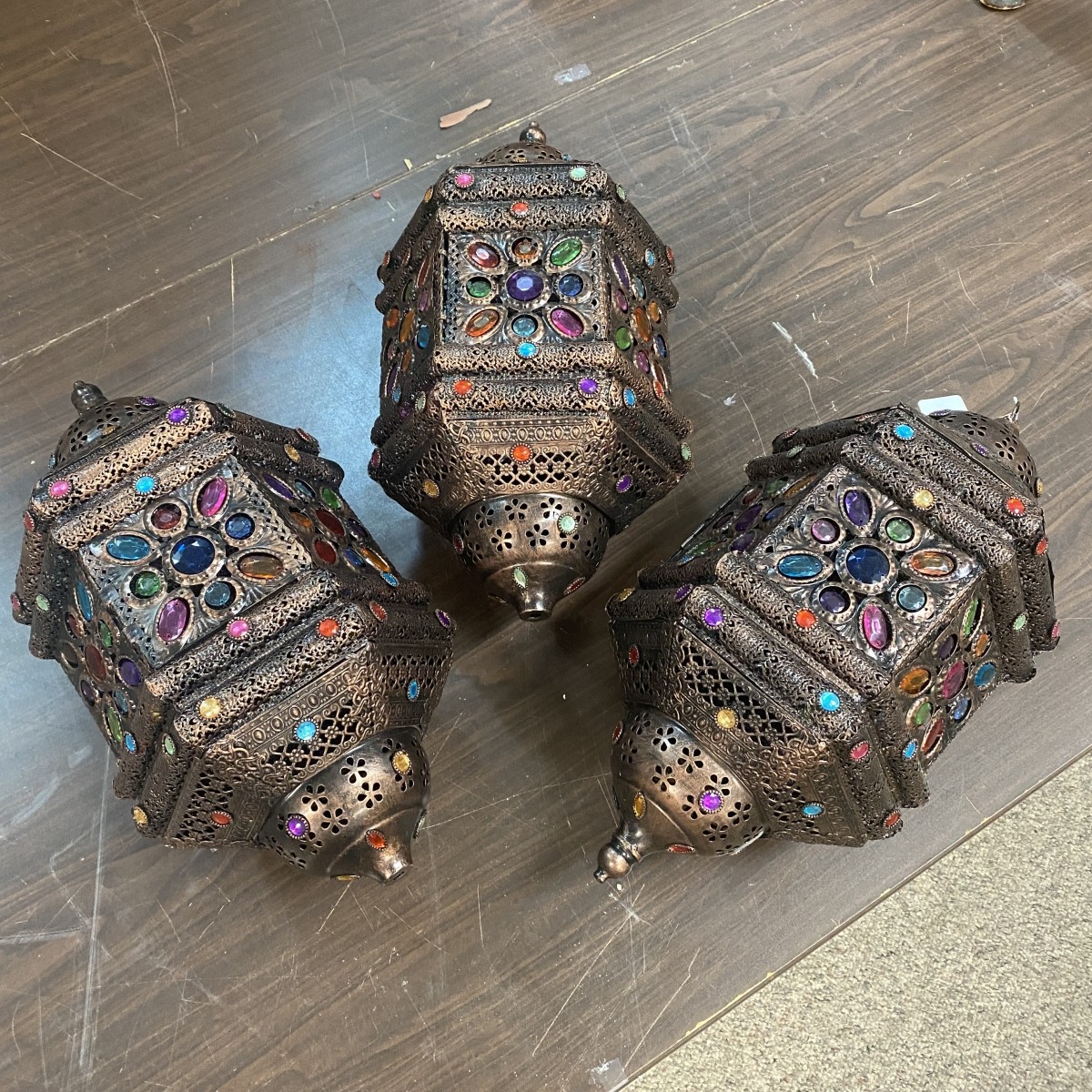 Three (3) Modern Moroccan Style Bejeweled Lanterns. Measures 22" x 11-1/2". Condition: Good condition. Some jewels are slightly loose and typical rubbing. Estimate: $50.00 - $150.00 Domestic Shipping: Third party