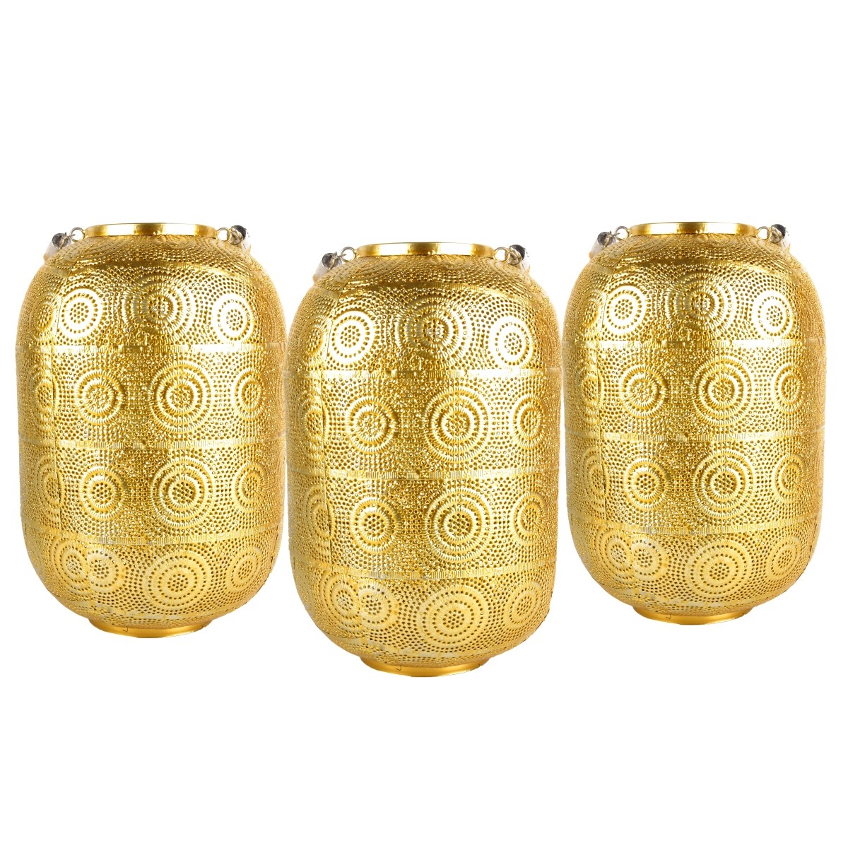 Lot of Three (3) Modern Reticulated Gilt Metal Lanterns. Two measure 12-3/8" x 8-1/2". One is slightly smaller measuring 12-1/4" x 8". Condition: Good condition. Estimate: $50.00 - $100.00 Domestic Shipping: Third party