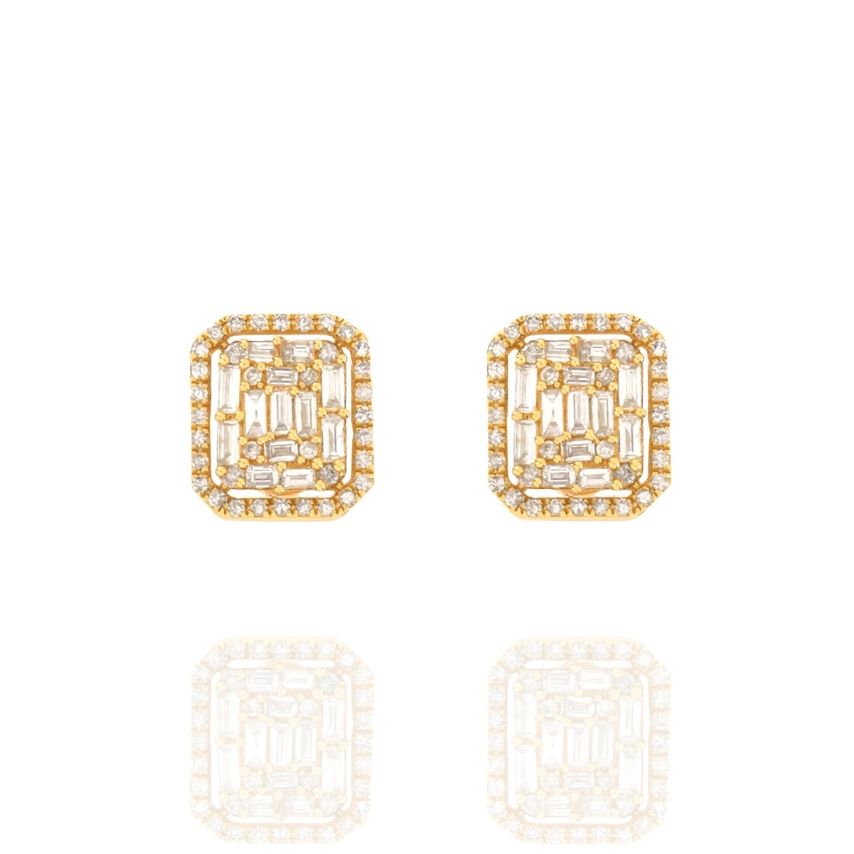 Approx. .80 Carat TW Baguette and Round Brilliant Cut Diamond and 14 Karat Yellow Gold Ear Studs. Diamonds I-J color, VS-SI clarity. Measure 3/8" sq. . Approx. weight: 2.26 grams Condition: Very good condition. Estimate: $900.00 - $1200.00 Domestic Shipping: $28.00