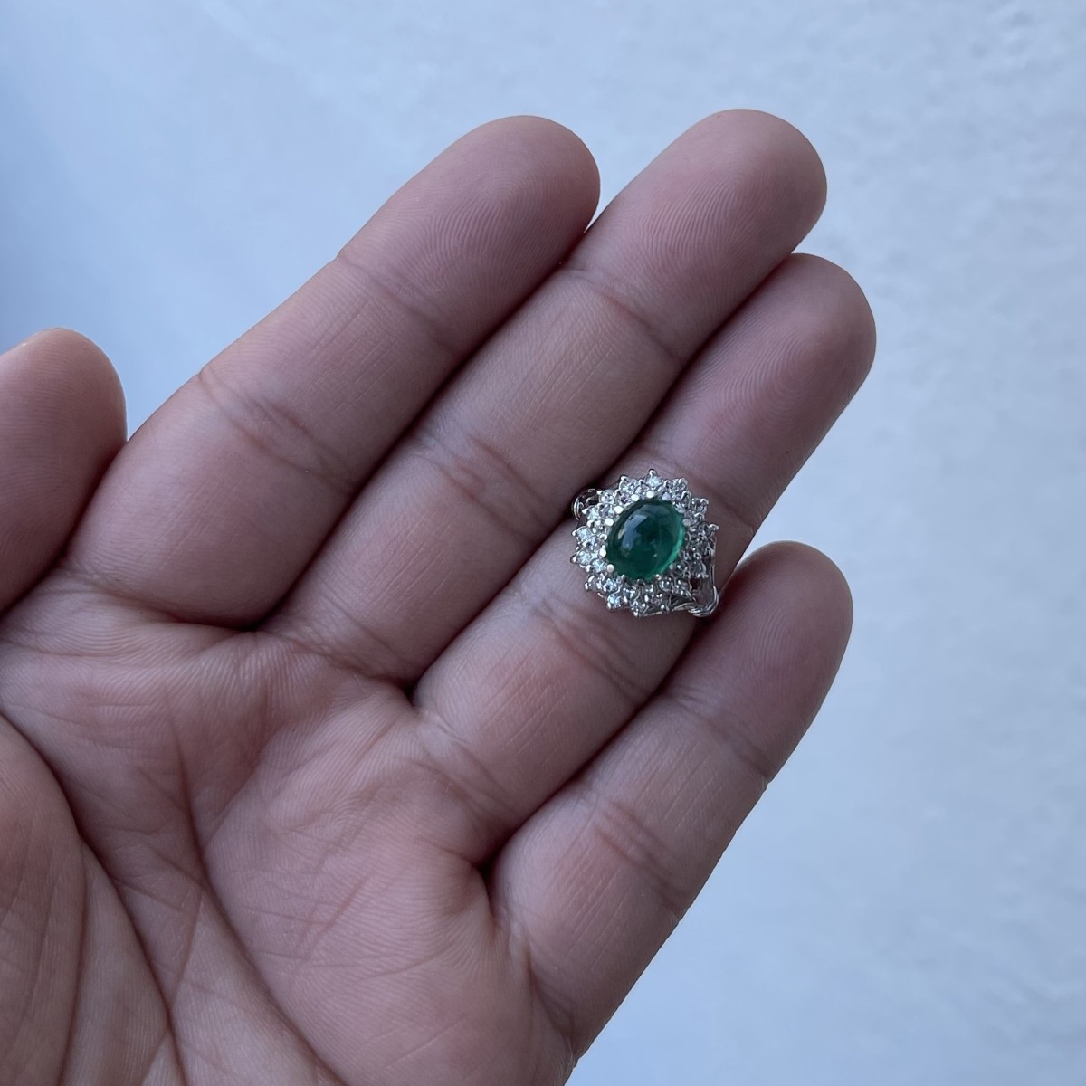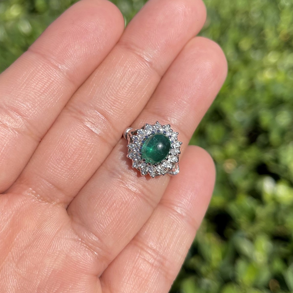 Approx. 2.75 Carat Oval Cabochon Emerald, .50 Carat TW Round Brilliant Cut Diamond and 14 Karat White Gold Ring. Emerald with vivid color. Diamonds G-H color, VS clarity. Stamped 14K. Ring size 7. Approx. weight: 5.12 grams. Condition: Very good condition. Estimate: $1000.00 - $1500.00 Domestic Shipping: $28.00