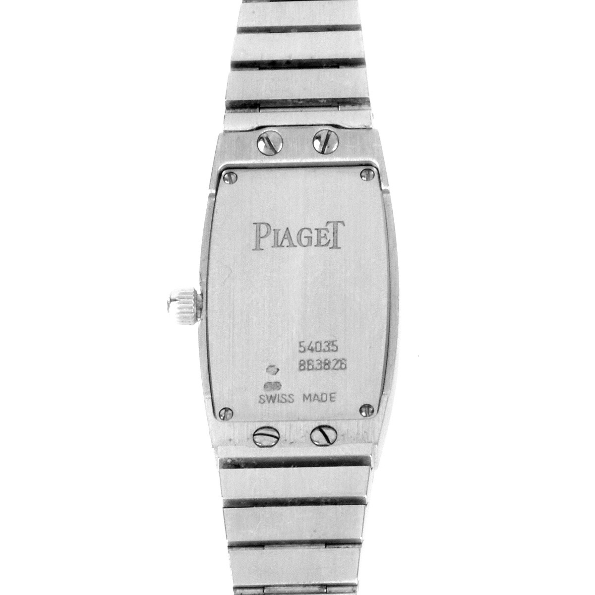 Lady's Piaget Pave Set Diamond and 18 Karat White Gold LImelight Tonneau Bracelet Watch, Quartz Movement. Diamonds D-E-F, VVS-VS clarity. Signed, ref. 54035 case no.863826, stamped 750, Swiss hallmark. Case measures 33.5 x 14mm; Bracelet measures 6-5/8" L. Approx. weight: 71.0 grams. No box or papers. Condition: Very good pre-owned condition. Needs a battery. Please note the gallery does not warranty the running condition of watches. Estimate: $25,000.00 - $45,000.00 Domestic Shipping: $34.00