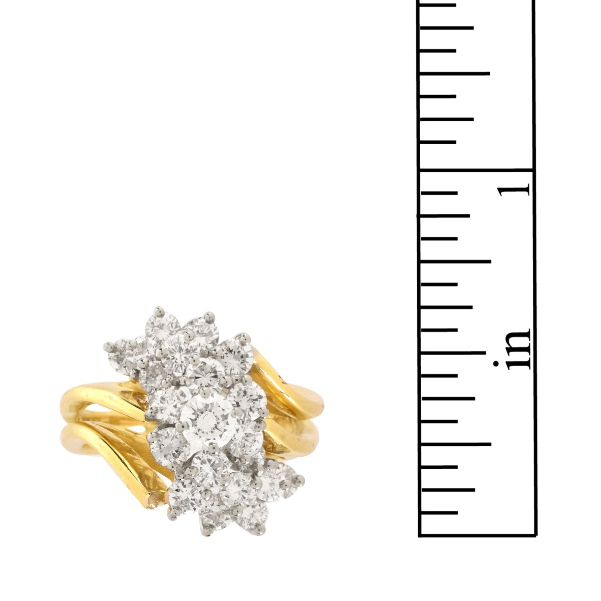 Vintage Approx. 1.25 Carat TW Twenty One Round Brilliant Cut Diamond and 18 Karat Yellow Gold Waterfall Cluster Ring. Diamonds G-H color, VS1-SI1 clarity. Stamped 18K, 16709, 1971. Ring size 4. Approx. weight: 6.04 grams. Condition: Very good condition. Estimate: $400.00 - $600.00 Domestic Shipping: $28.00