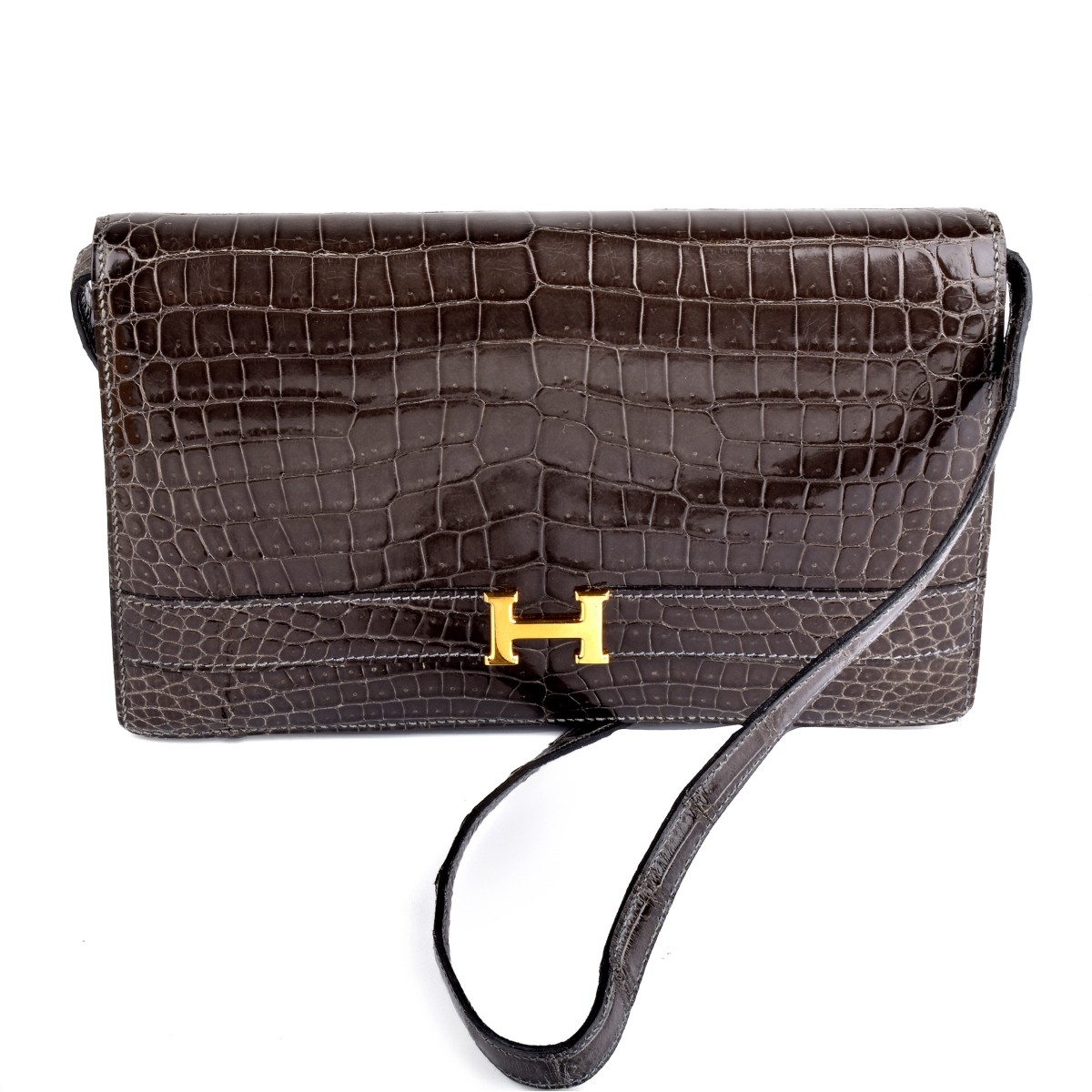Vintage Hermes Alligator Shoulder Bag. Appropriately labeled. Cross over closure with gold tone H accent. Exterior pocket beneath the closure and interior bears a patch pocket and a pocket with zipper. Measures 6" x 9-1/4". Condition: Good used condition with some signs of wear. Estimate: $1000.00 - $3000.00 Domestic Shipping: $66.00