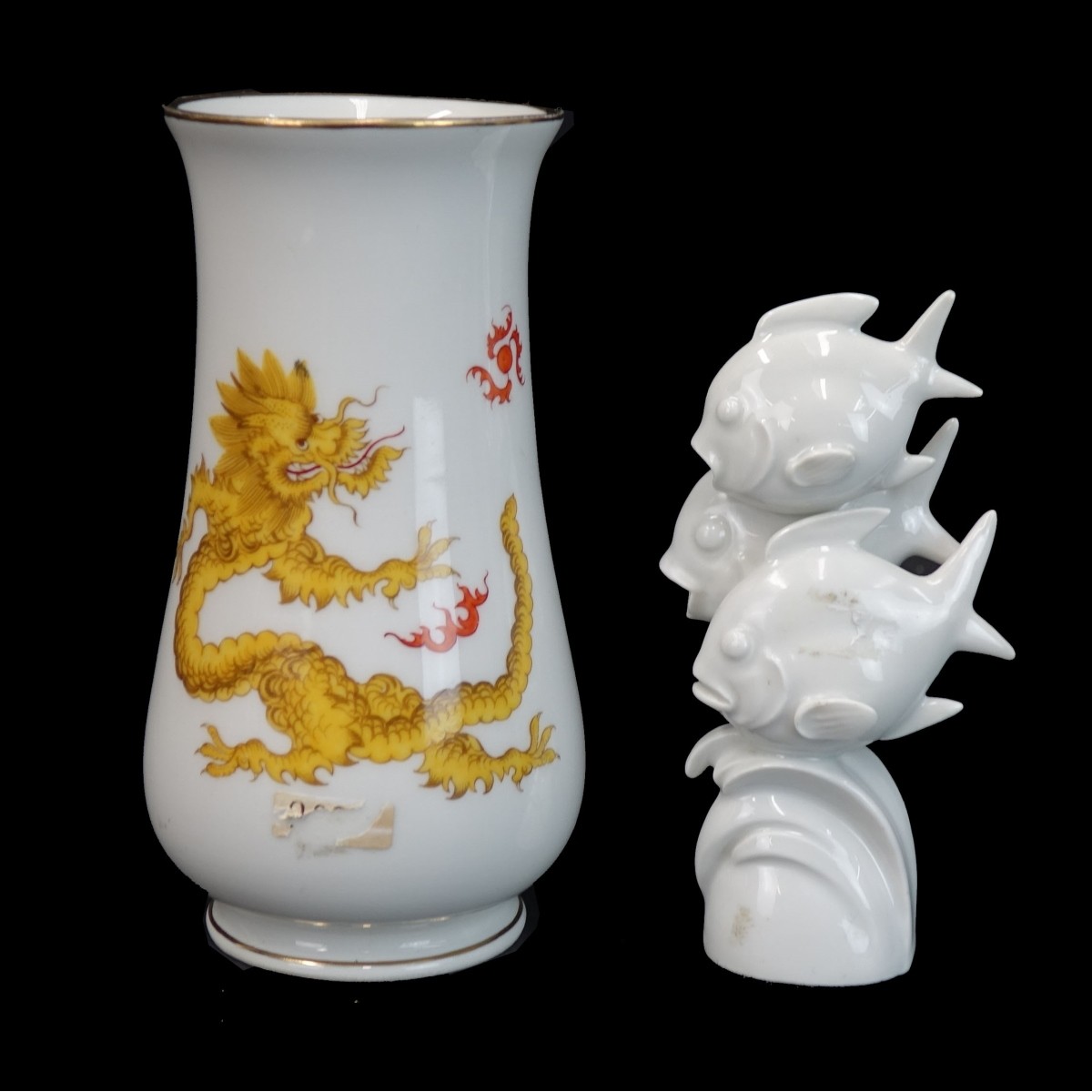 Grouping of Two (2) Vintage Meissen Porcelain Tableware. Lot consists of a school of fish figurine along with a Ming dragon vase. Each appropriately signed. Vase measures 5-3/4" x 3-1/4", figurine measures 4-3/4' x 2-1/2". Condition: Good condition. Estimate: $100.00 - $400.00 Domestic Shipping: $48.00