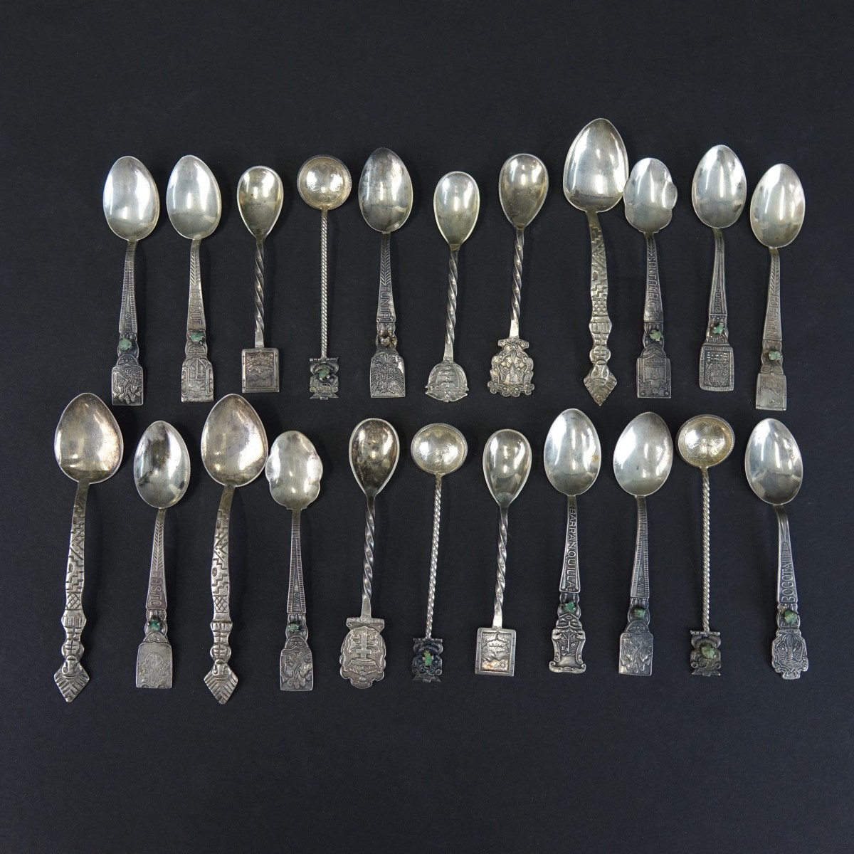 Grouping of Twenty-Two (22) Sterling Silver and 900 Silver Souvenir Spoons. A few with mounted stones at the handle. Largest measures 4-3/8", smallest measures 3-3/4". Total approx. weight: 7 troy ounces. Condition: Needs cleaning, some with missing stones otherwise good condition. Estimate: $50.00 - $150.00 Domestic Shipping: $48.00