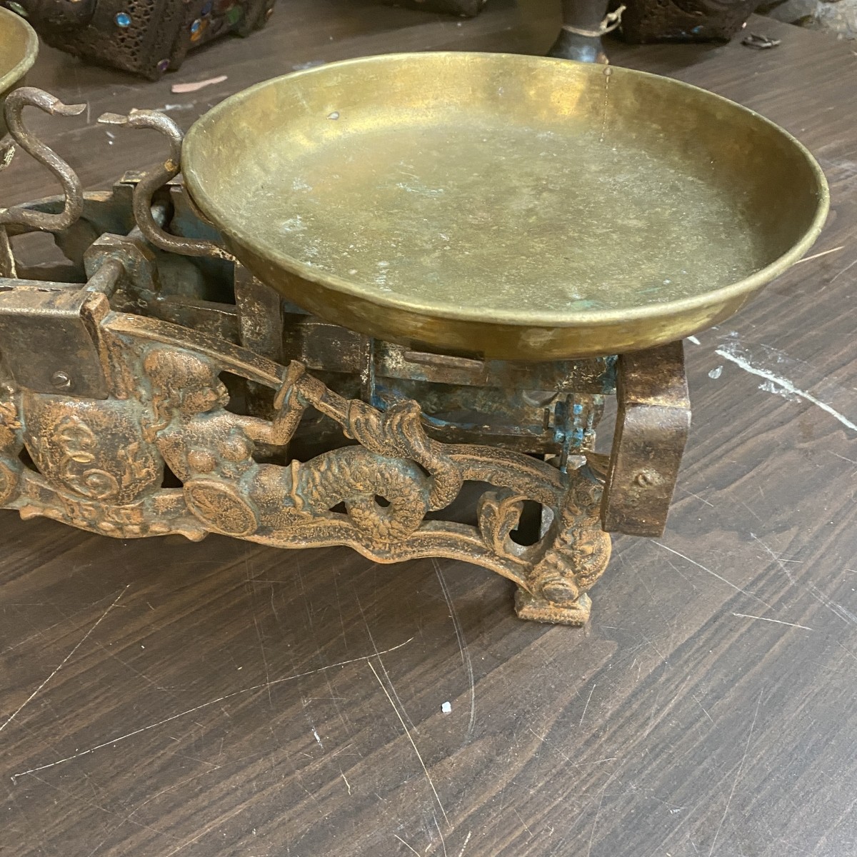 Antique Cast Iron Candy Scale with Brass Pans. Mermaid motif and marked 15 krs. Measures 9" x 21" x 8" (w/o pans). Condition: Corrosion and oxidation to the surface, no weights. Estimate: $50.00 - $100.00 Domestic Shipping: Third party