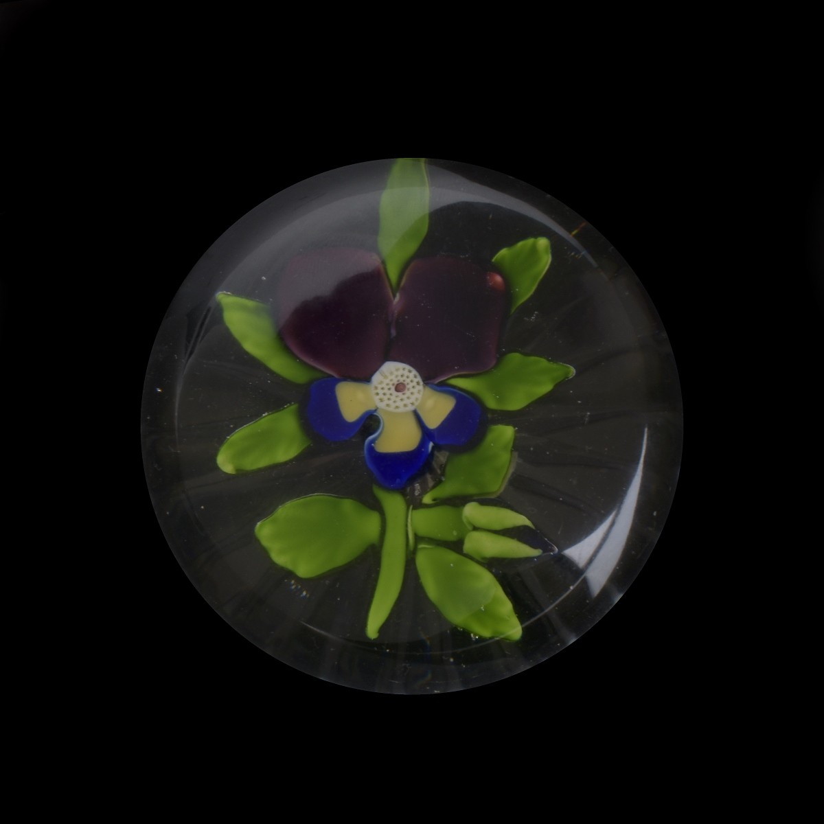 Antique Baccarat Pansy Art Glass Paperweight. Center pansy flower in violet, yellow, and cobalt blue with honeycomb cane center, bordered by five leaves. Clear star cut ground. Measures 2-1/4" H x 3" diameter. Provenance: L.H. Selman, LTD. The Glass Gallery. Condition: Small possible internal inclusion to base otherwise good condition Estimate: $250.00 - $5000.00 Domestic Shipping: $32.00