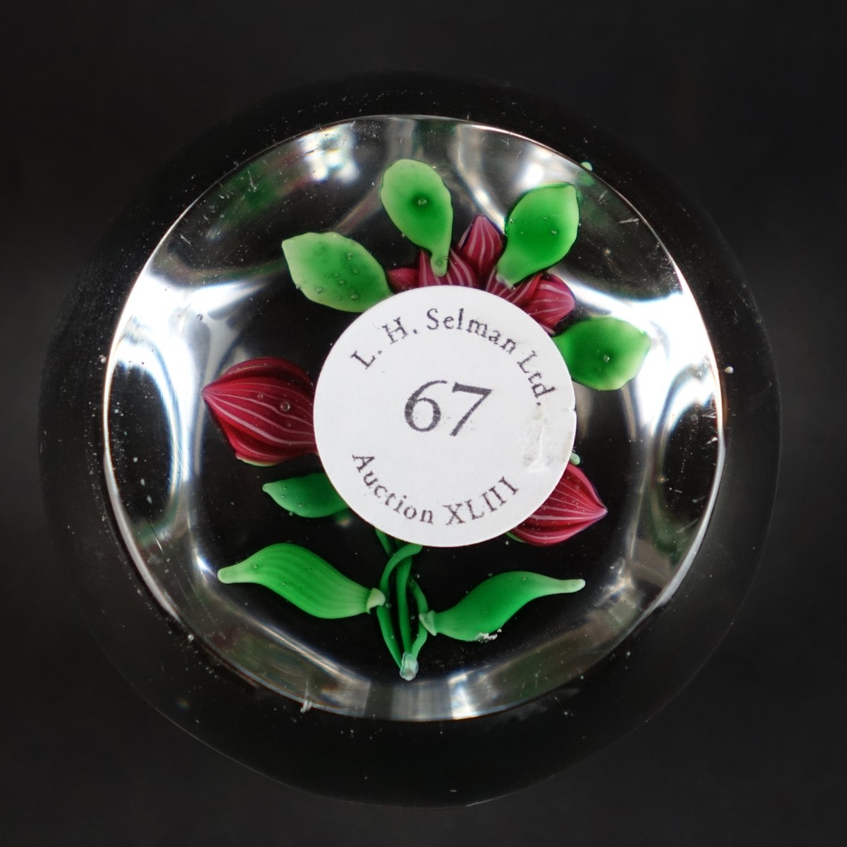 Antique Baccarat Faceted Art Glass Paperweight. Large single clematis flower with green and pink petals, Millefiori center cane. Unsigned. L.H. Selman auction label attached. Measure 1-1/2" H x 2-1/4" W. Condition: A few small interior scattered bubbles Estimate: $800.00 - $1500.00 Domestic Shipping: $32.00