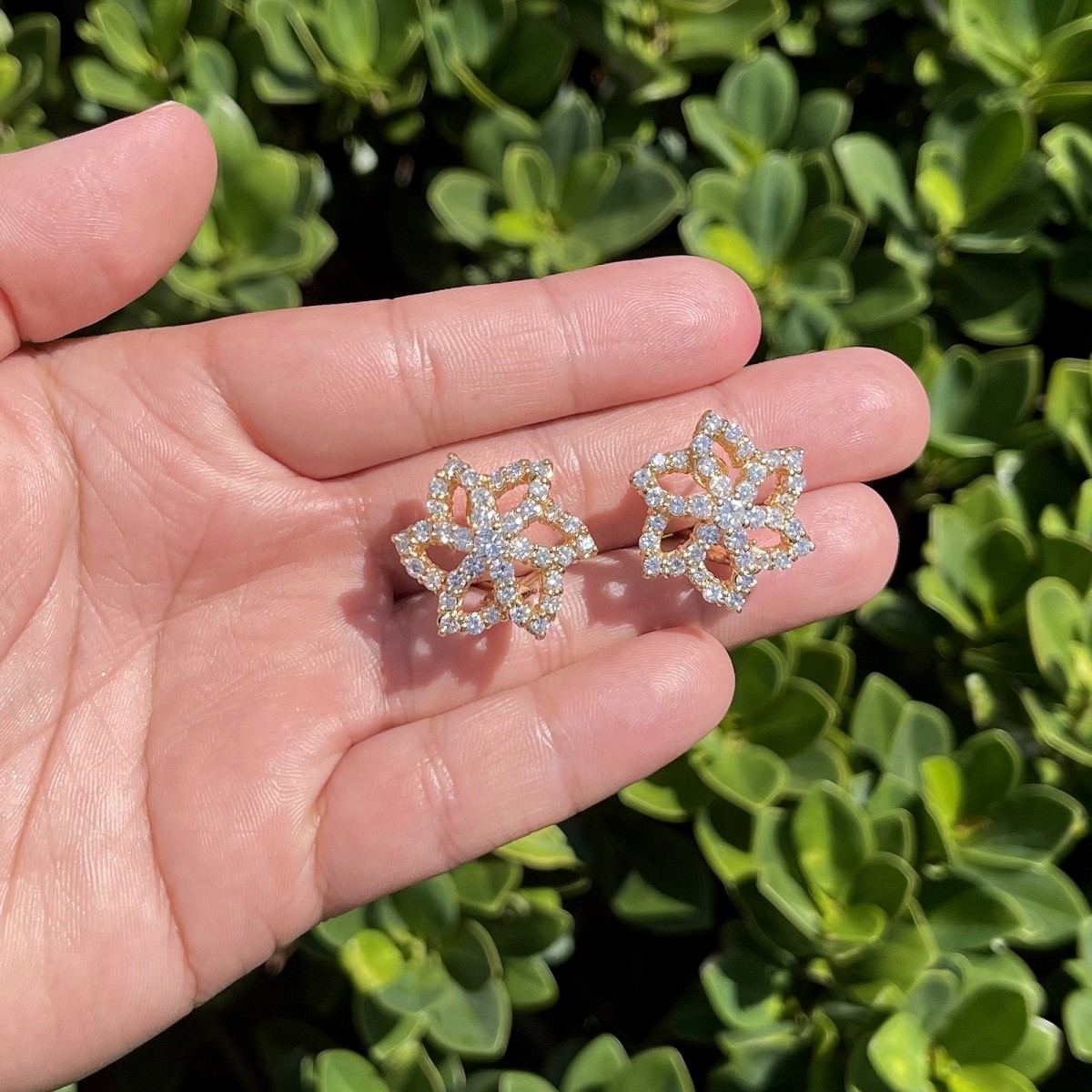 Approx. 3.50 Carat TW Seventy Four Round Brilliant Cut Diamond and 14 Karat Yellow Gold Flower Earrings. Diamonds G-H color, VS1-SI1 clarity. Stamped 14K. Measure 1" diam. Approx. weight: 13.17 grams. Condition: Very good condition. For additional information and/or WhatsApp video please contact our resident GIA Graduate Gemologist, Russ Kodner at 954.650.5030 Estimate: $2500.00 - $3500.00 Domestic Shipping: $30.00