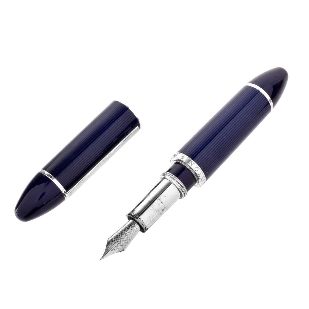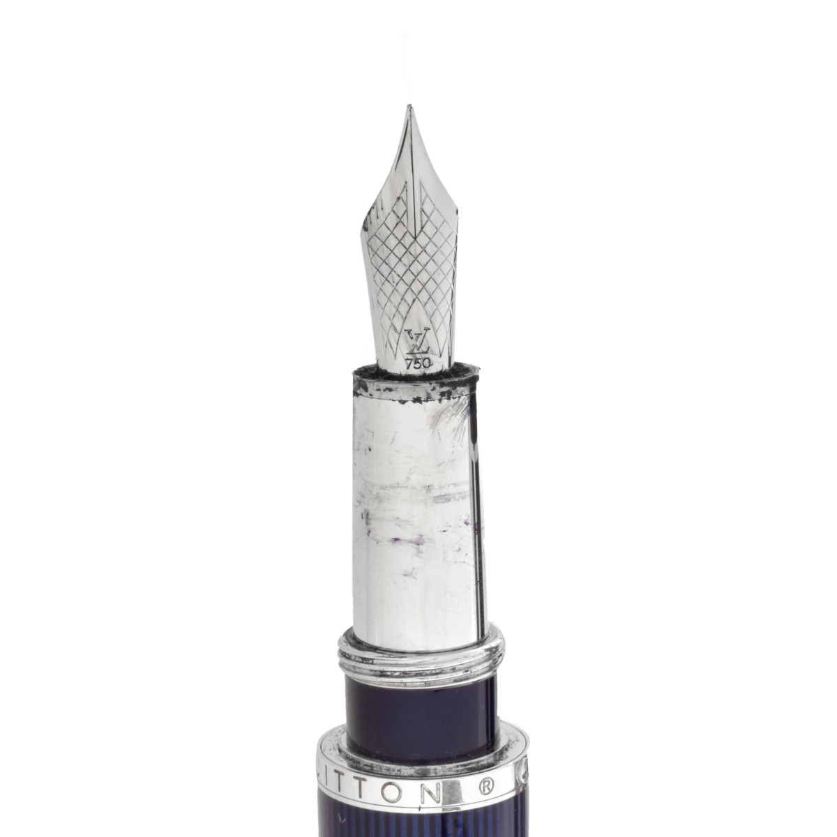 Louis Vuitton Bleu Lacquer Cargo Fountain Pen with Platinum Plated Accents. LV monogram and 750 (18K) standard mark on white gold nib with bears a geometric engraved embellishment. Louis Vuitton makers mark en center accent. Measures 5-3/4" x 3/4". From the collection of The Honorable Ned L. Siegel, Former US Ambassador to the Commonwealth of the Bahamas Condition: Nib need a routine cleaning, very minor surface scuffs. Not examined for writing. Estimate: $500.00 - $1000.00 Domestic Shipping: $32.00