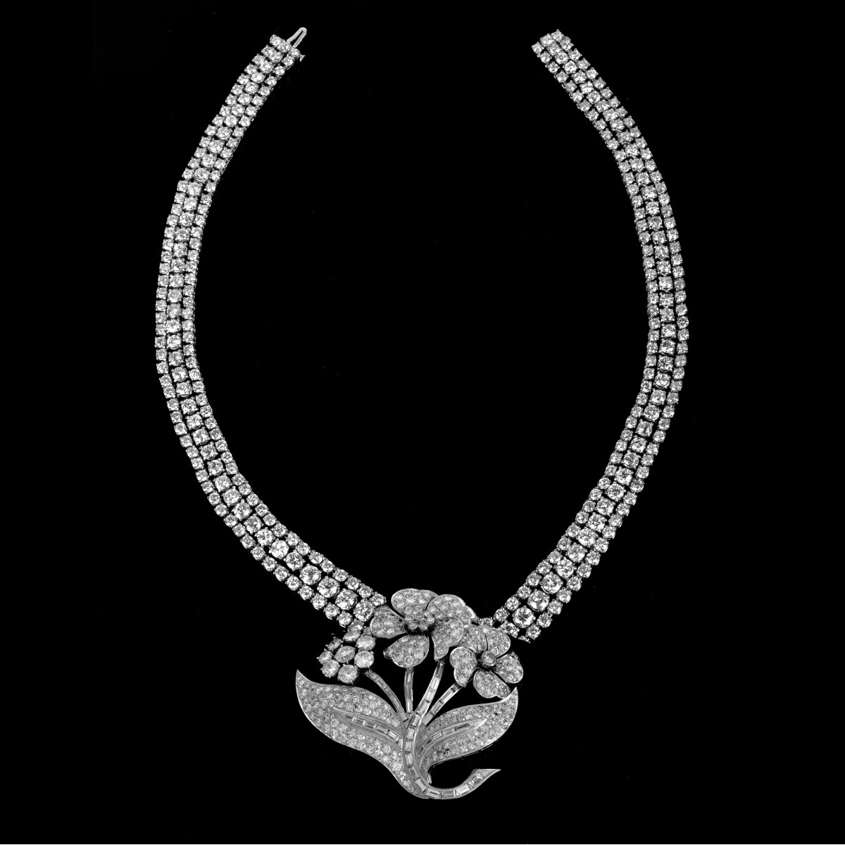 Vintage Round Brilliant and Baguette Cut Diamond and Platinum Pendant Necklace. Diamonds E-F color, VS1-VS2 clarity. Measures 16" L, 2-1/8" drop. Approx. weight: 94.77 grams. Condition: Very good vintage condition. Estimate: $30.000.00 - $50,000.00 Domestic Shipping: $36.00