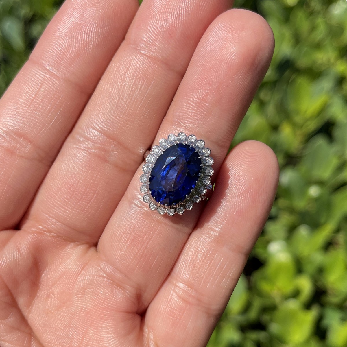 Approx. 9.2 Carat Oval Cut Ceylon Sapphire,.90 Carat TW Round Brilliant Cut Diamond and 18 Karat White Gold Ring. Sapphire with vivid color, VVS clarity, measures Diamonds F-G color, VS1-VS2 clarity. Stamped 18K. Ring size . Approx. weight: Condition: Very good condition. For additional information and/or WhatsApp video please contact our resident GIA Graduate Gemologist, Russ Kodner at 954.650.5030 Estimate: $8000.00 - $12,000.00 Domestic Shipping: $28.00