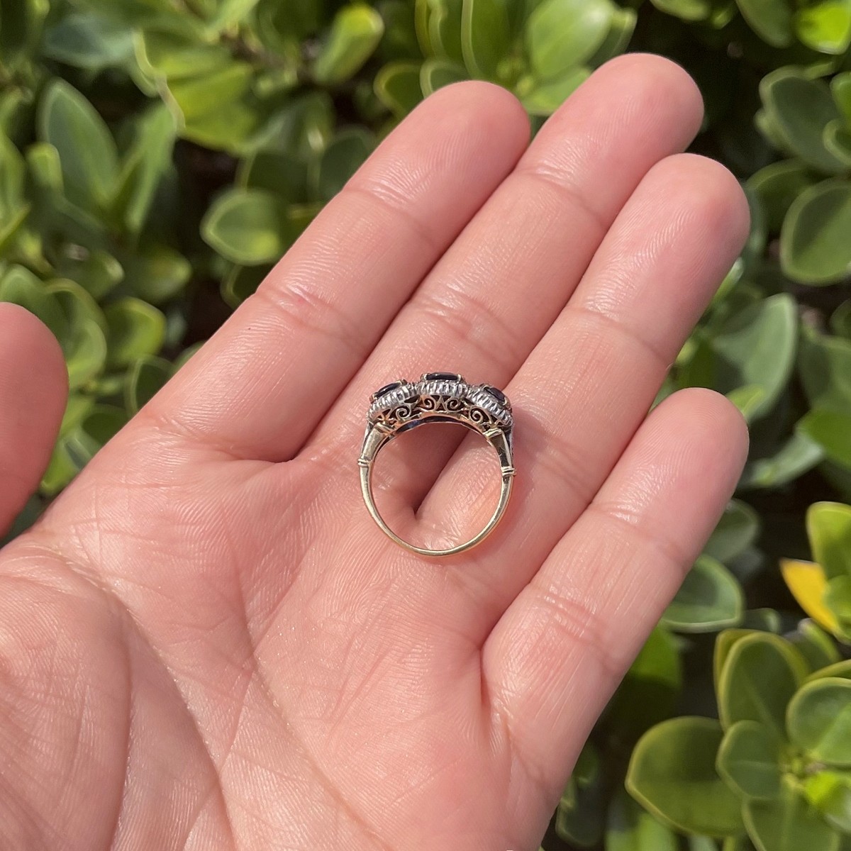 Vintage Oval Cut Sapphire, Small Round Brilliant Cut Diamond and 14 Karat Yellow Gold Three Stone Ring. Sapphires with vivid color. Ring size 6-1/2. Approx. weight: 4.14 grams. Condition: Very good vintage condition. For additional information and/or WhatsApp video please contact our resident GIA Graduate Gemologist, Russ Kodner at 954.650.5030 Estimate: $1000.00 - $1500.00 Domestic Shipping: $28.00