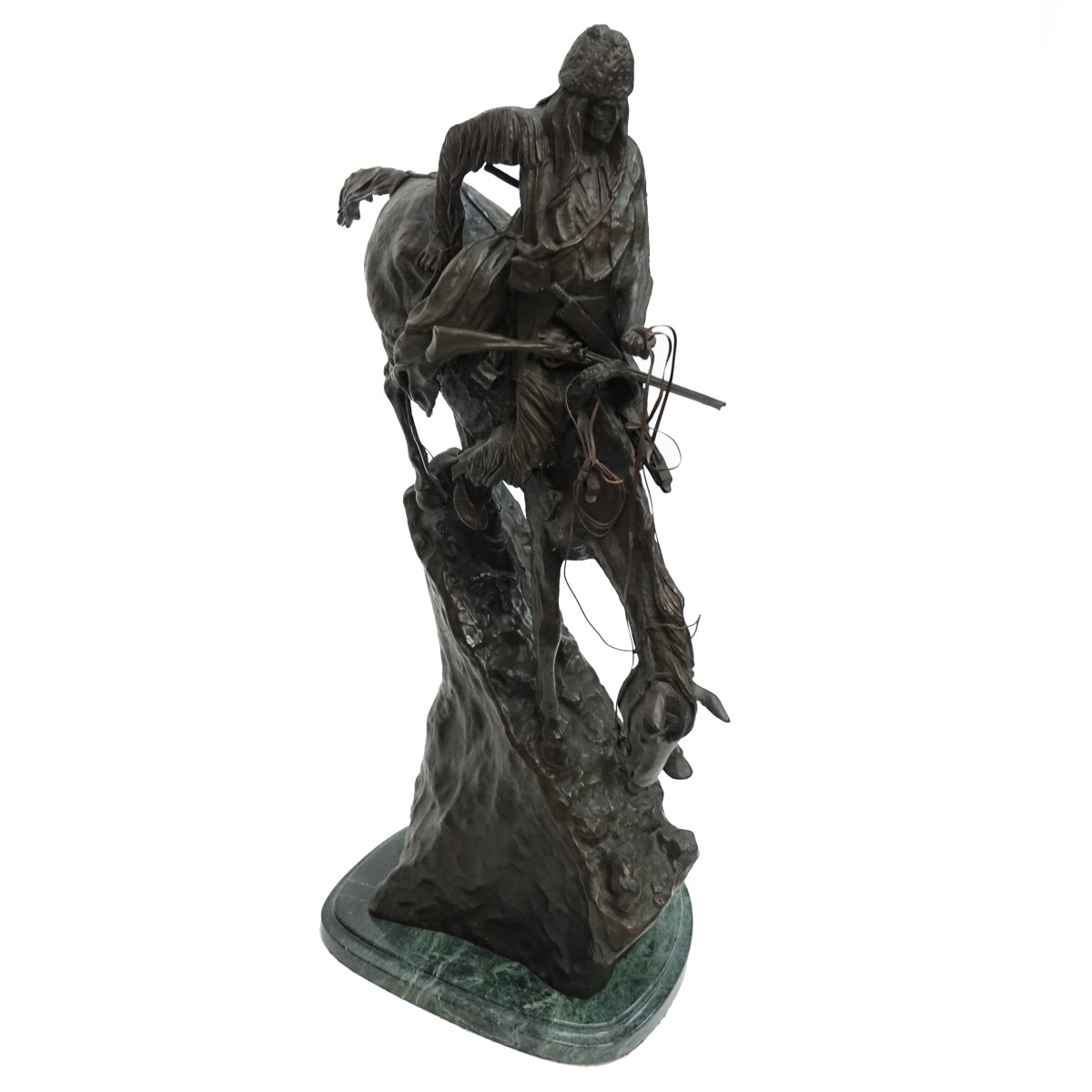 After: Frederic Sackrider Remington, American (1861 - 1909) Bronze Sculpture Mounted on Marble Base "The Mountain Man" Signed. Overall measures 28-3/4" x 10-3/4" x 14". Condition: Good condition. Estimate: $200.00 - $300.00 Domestic Shipping: Third party