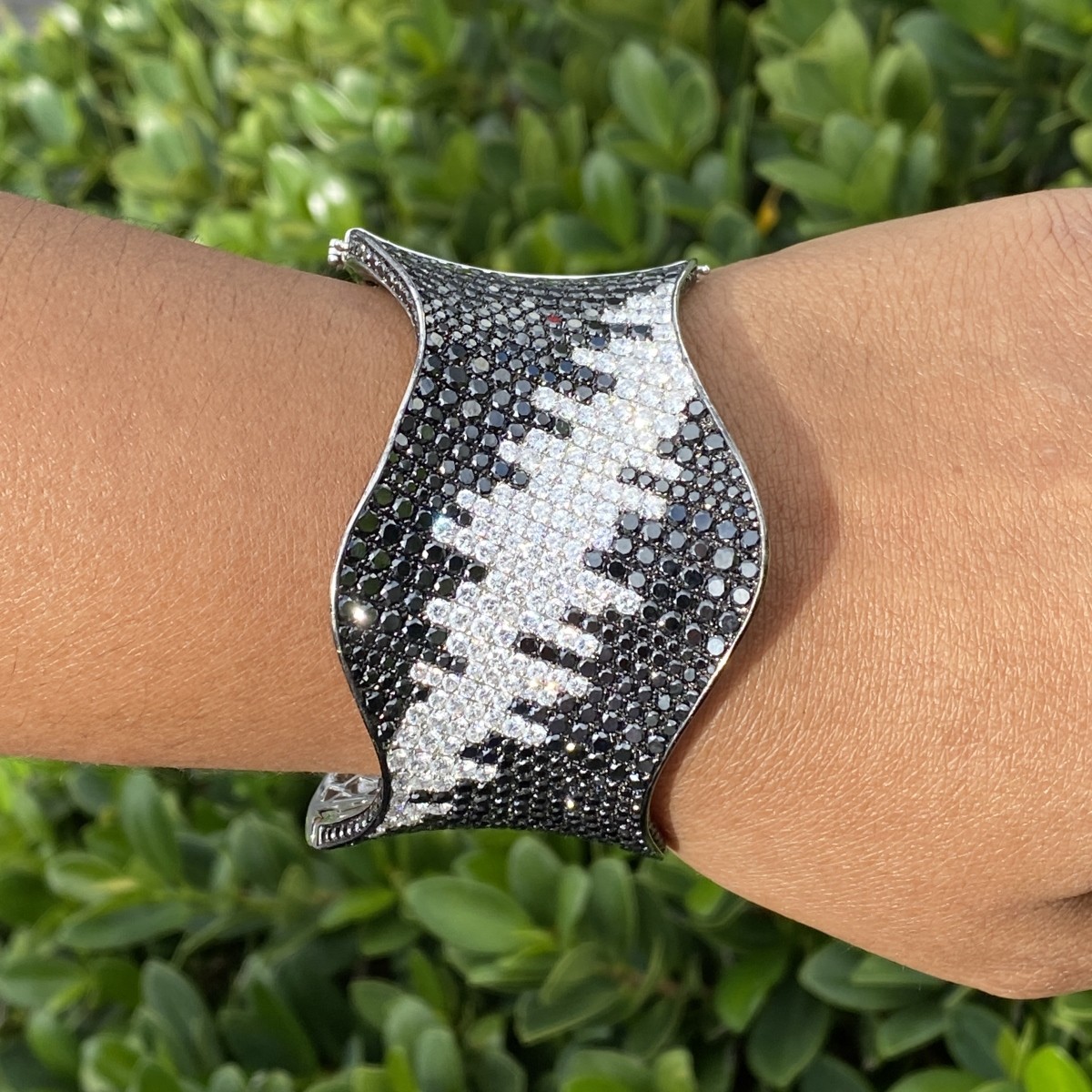 Contemporary Approx. 29.76 Carat TW Round Brilliant Cut Colorless and Fancy Black Diamond and 18 karat White Gold Wide Hinged Cuff bangle. Colorless diamonds D-E color. VS1-VS2 clarity with a few SI1 clarity. Measures 6-1/2" L, 1-3/4" W. Approx. weight: 110.42 grams. Condition: Very good condition. Slight wear from normal use to back. For additional information and/or WhatsApp video please contact our resident GIA Graduate Gemologist, Russ Kodner at 954.650.5030 Estimate: $15,000.00 - $25000.00 Domestic Shipping: $36.00