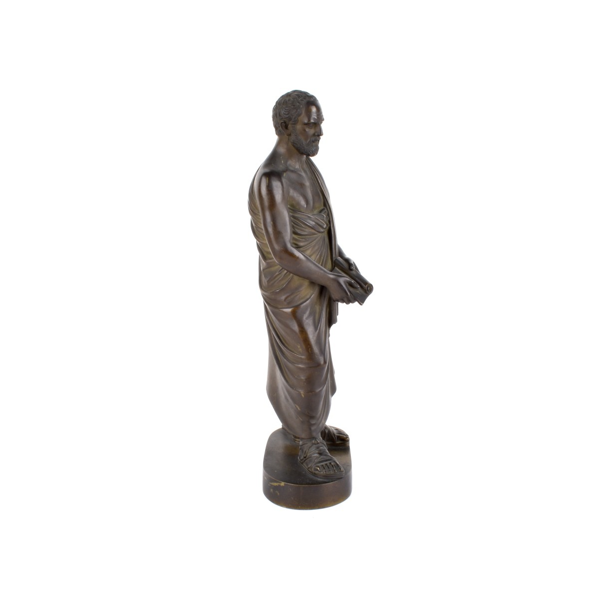 Early 20th Century European School Bronze Sculpture "Grecian Scholar" Unsigned. Measures 11-1/2" x 4-1/4". Condition: Rubbing to a few areas and surface scuffs to the base otherwise good condition. Estimate: $100.00 - $300.00 Domestic Shipping: $66.00