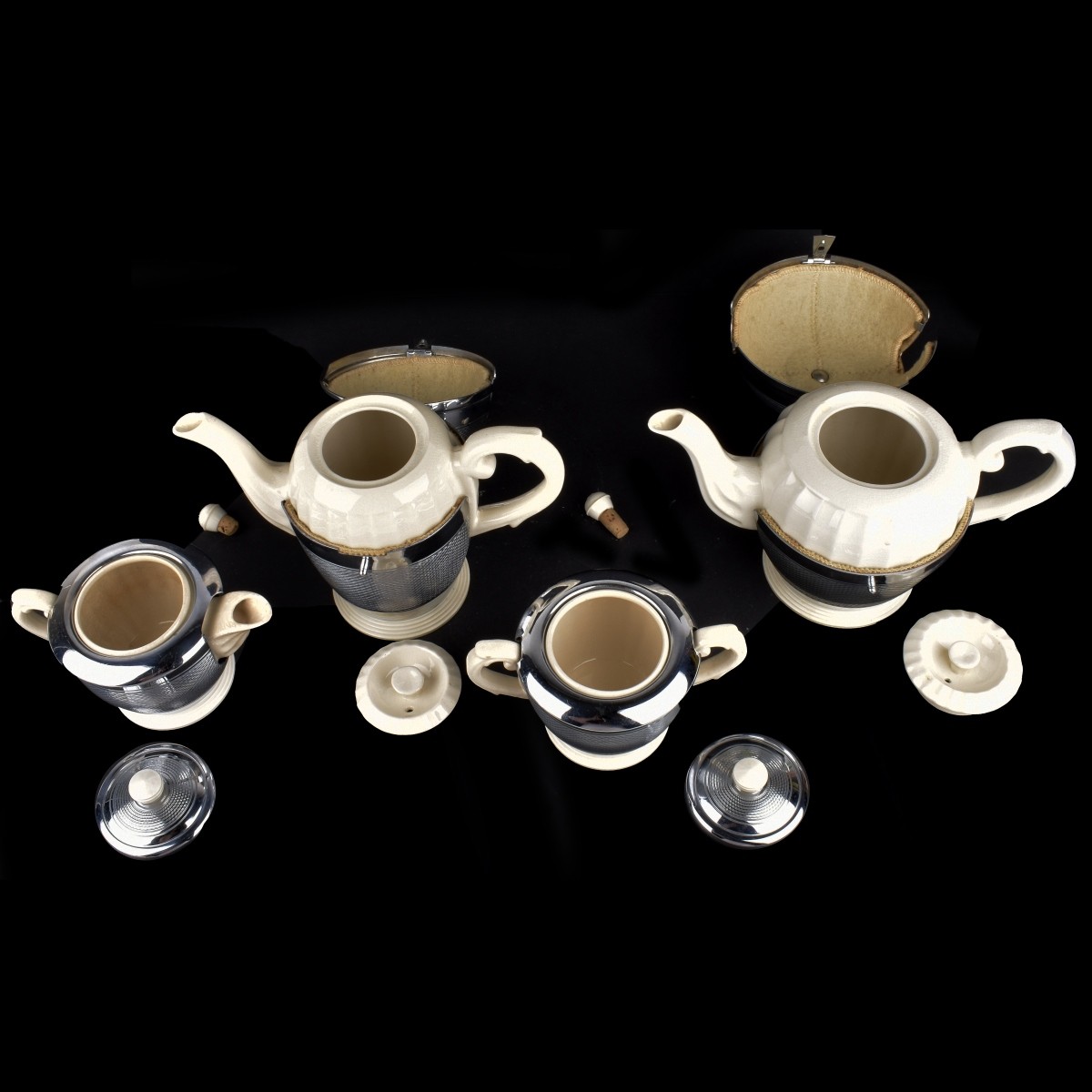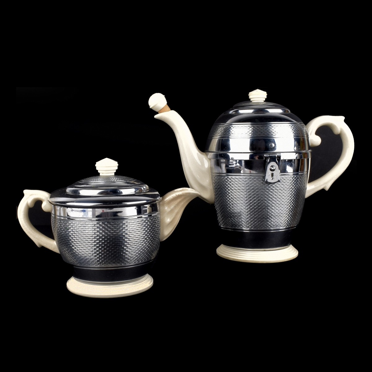 Unusual Art Deco English Balmoral Heatmaster Chrome and Pottery Four Piece Coffee and Tea Service. Including coffee pot, teapot, cream and sugar. Coffee pot and tea pot with removable insulated chrome outer case. Signed. Coffee pot measures 7-1/8, 8-1/2" W. Tea pot measures 6-1/4" H, 10" W. Condition: Very good condition. Estimate: $50.00 - $150.00 Domestic Shipping: $85.00