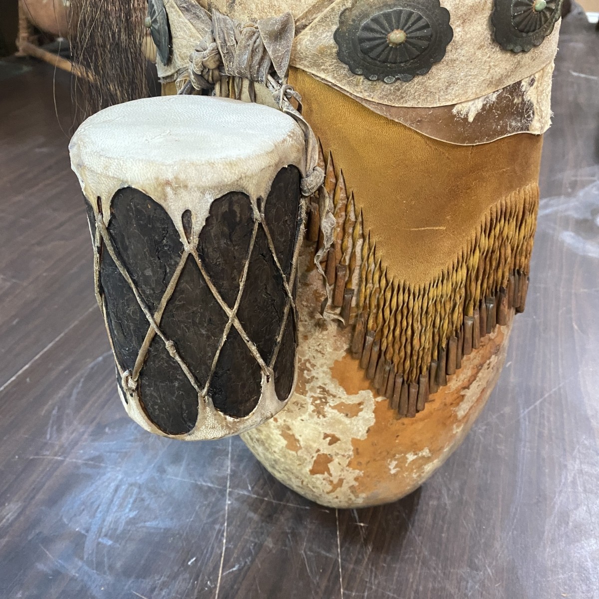 Mark & Karen Klay, American (20th Century) Mixed Media Gourd Kachina Sculpture "Two Birds" Signed and Inscribed on the Reverse Side. Measures 38-1/4" x 11", overall measures 45-1/2". Condition: Rubbing, soiling otherwise good condition. Estimate: $200.00 - $500.00 Domestic Shipping: Third party