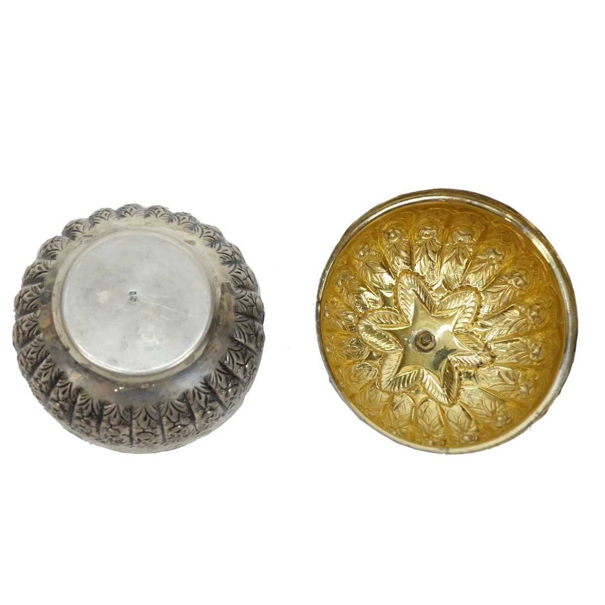 Vintage 800 Silver Repousse Covered Box with Bird Finial. Busy continuous floral detail, vermeil interior. Marked 800 and bears a makers mark to the base. Measures 4-1/2" x 4-1/4". Approx. weight: 5.93 troy ounces. Condition: Good condition. Estimate: $100.00 - $300.00 Domestic Shipping: $55.00