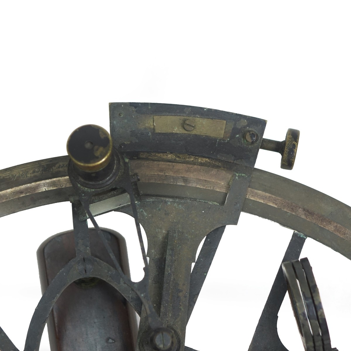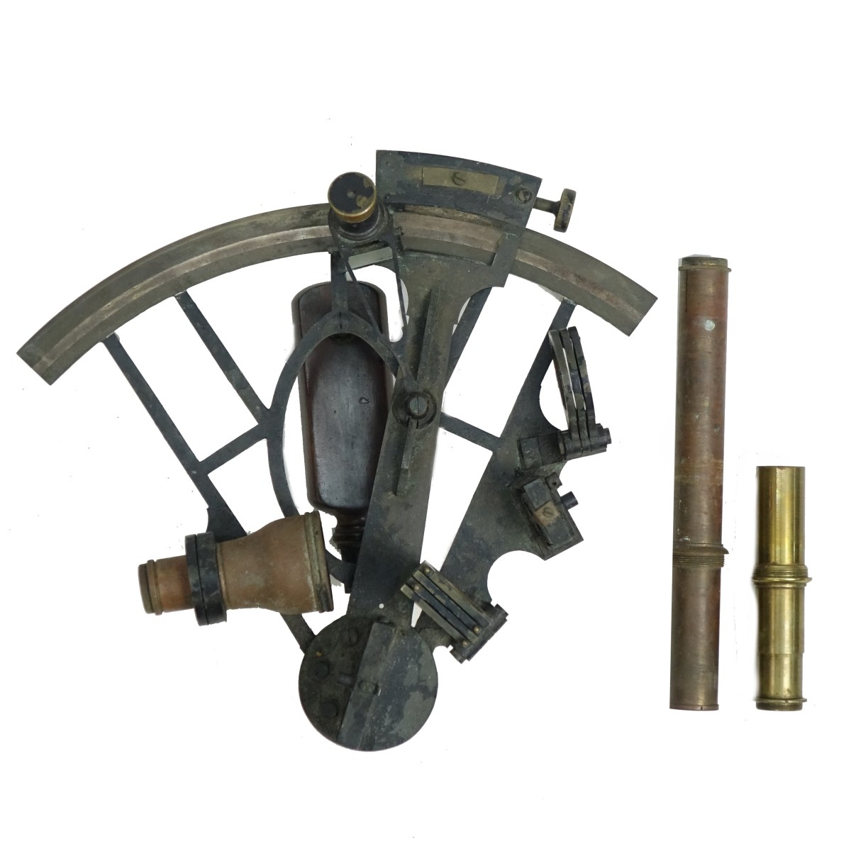 Antique John Bliss & Co Marine Sextant in Fitted Box. Brass casing with lenses. Box labewled on interior. Instrument measures 4-1/4" x 9-1/4" x 10". Box measures 4-1/4" x 11-7/8" x 9-3/4'. Condition: Instrument has oxidation and rubbing. Lot will be sold in As is condition. Estimate: $50.00 - $150.00 Domestic Shipping: $78.00