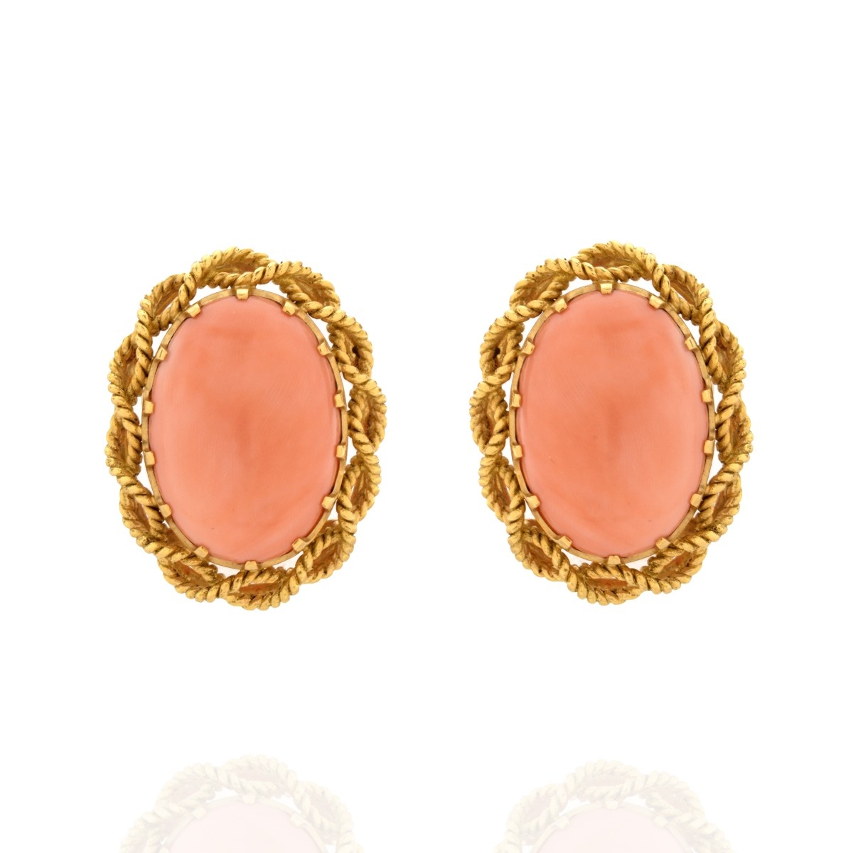 Vintage Circa 1960s Cabochon Coral and 18 Karat Yellow Gold Clip Back Earrings. Stamped 750. Coral measures 22.5 x 15.8mm. Earrings measure 1-1/8" H, 7/8" W. Approx. weight: 26.20 grams. Condition: Very good vintage condition. Estimate: $2000.00 - $3000.00 Domestic Shipping: $30.00